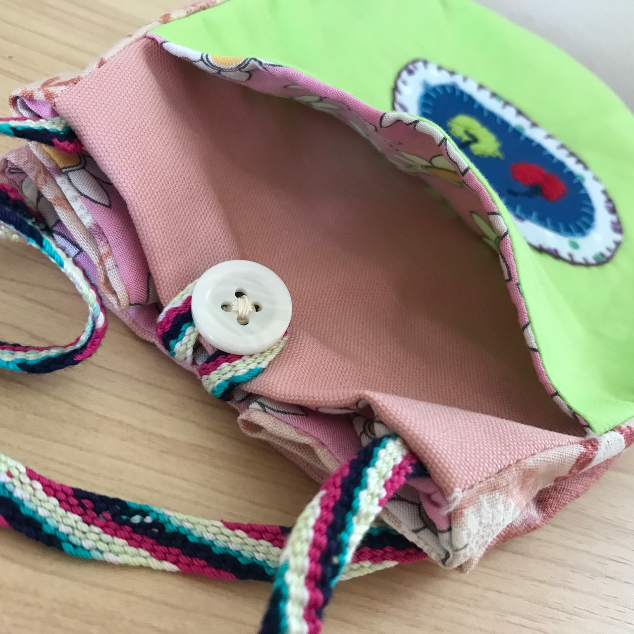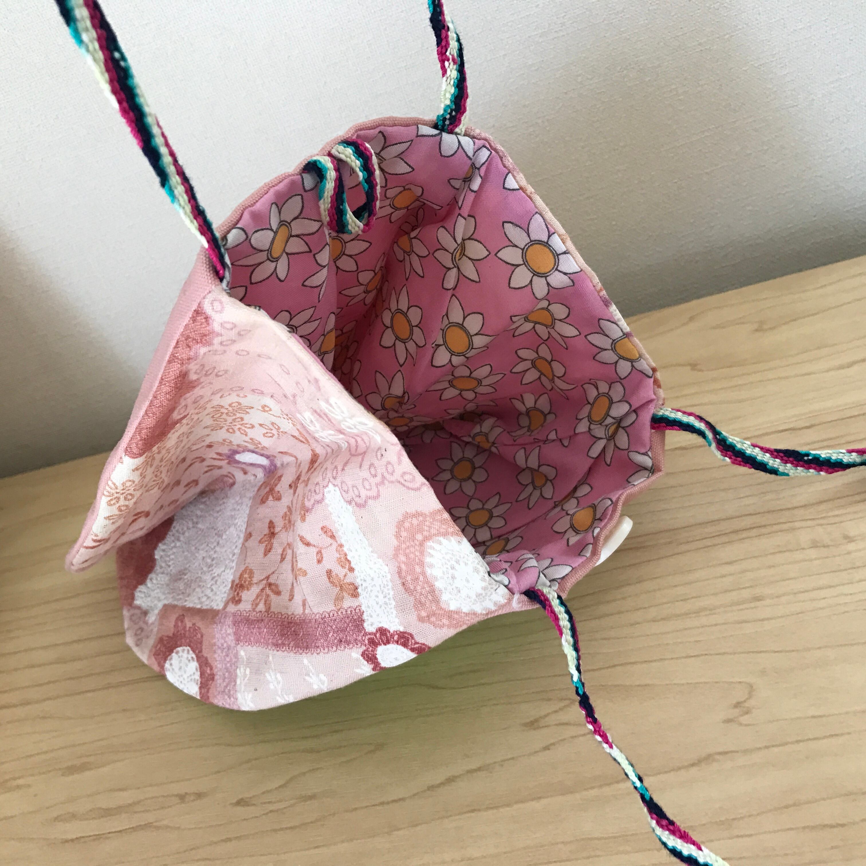 持ち手は組み紐。りんごの刺繍を施し、内側の布も花柄で、凝った作りです。