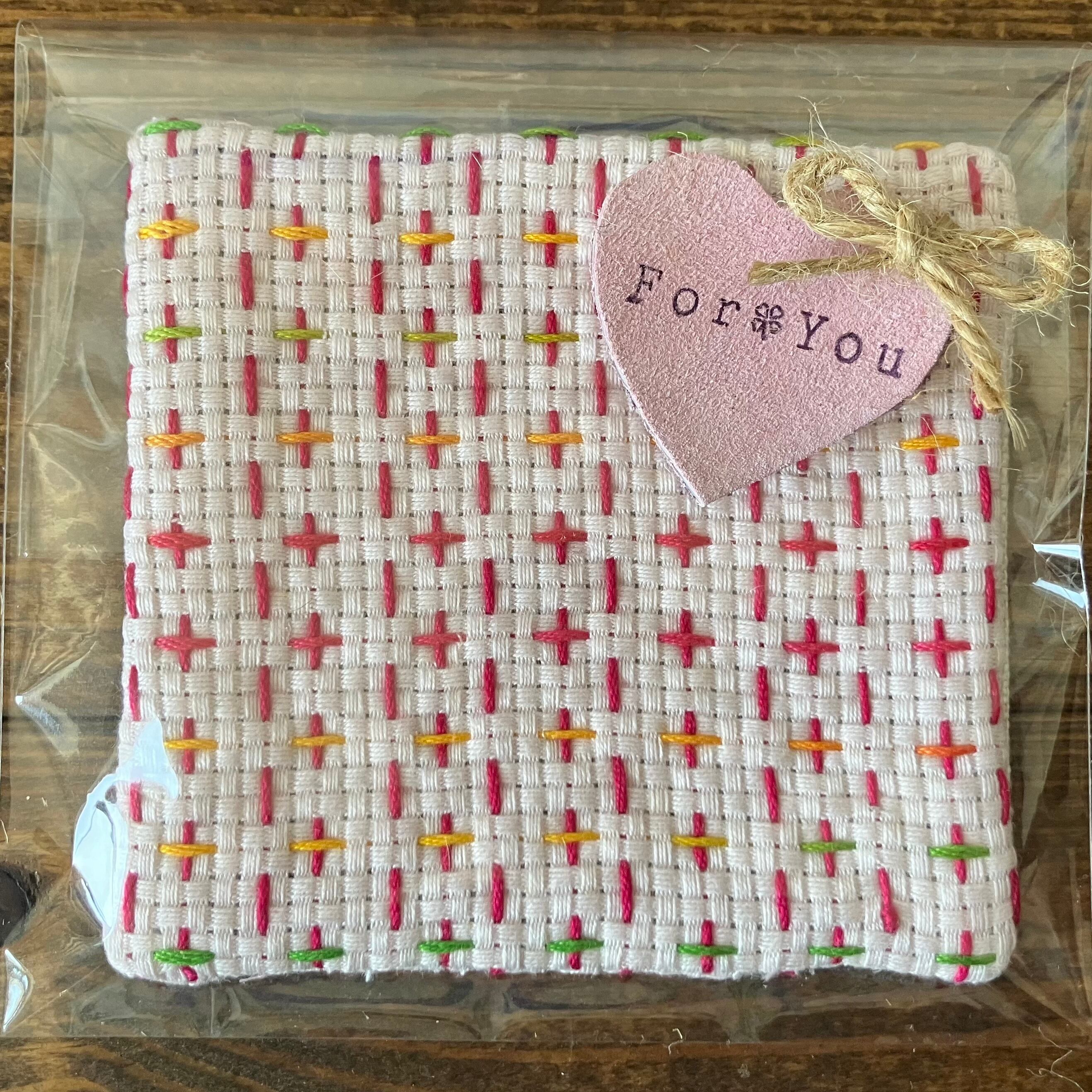 (製作: コースター/地域活動支援センターHIKARI、ハート型革タグ/地域活動支援センターはーと工房)