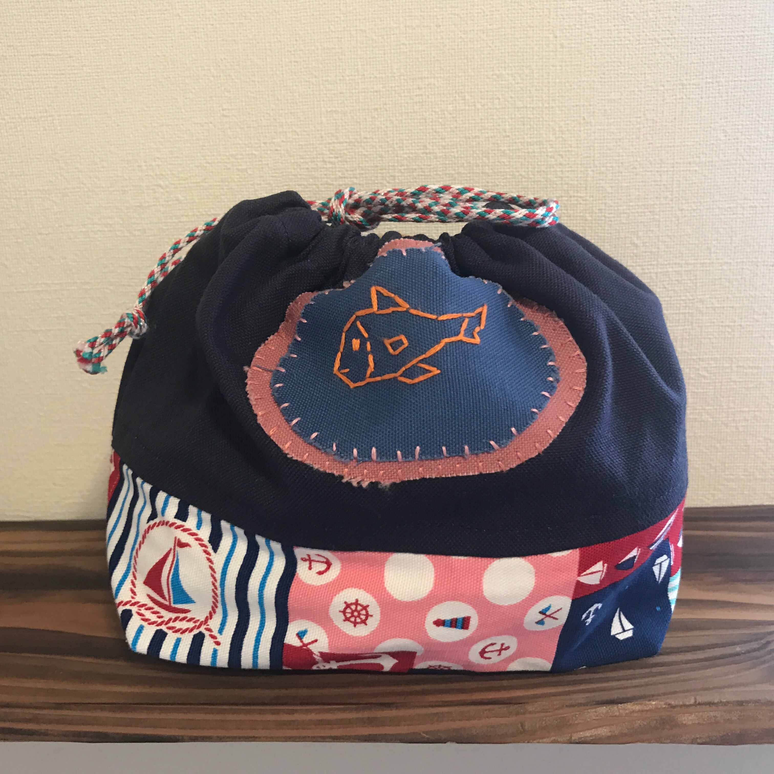片面ずつ魚の刺繍を施した一点物の可愛いお弁当袋です。