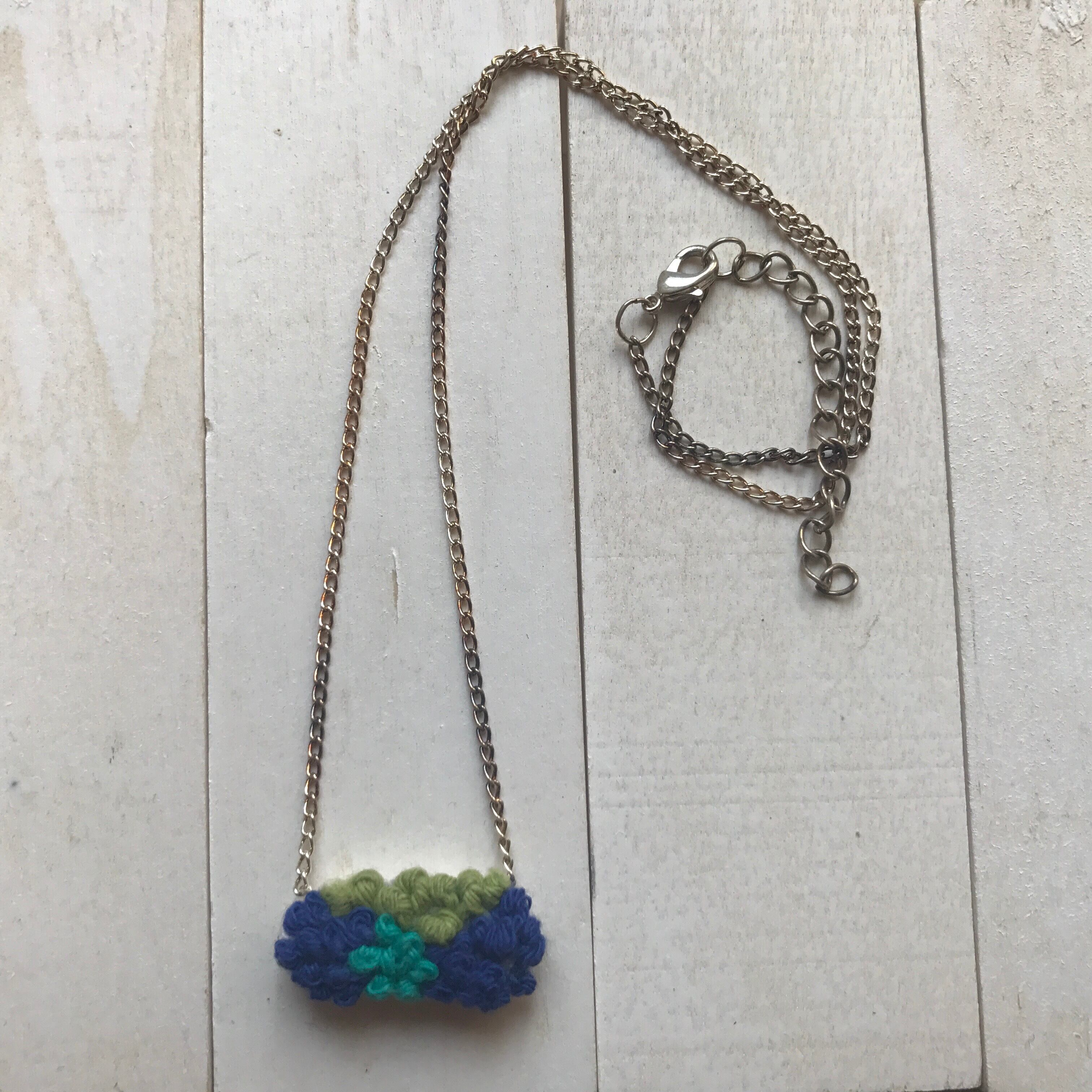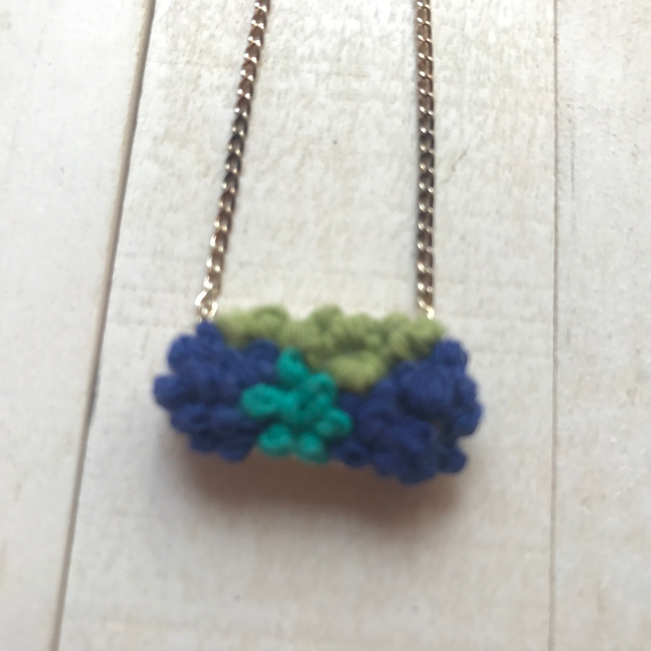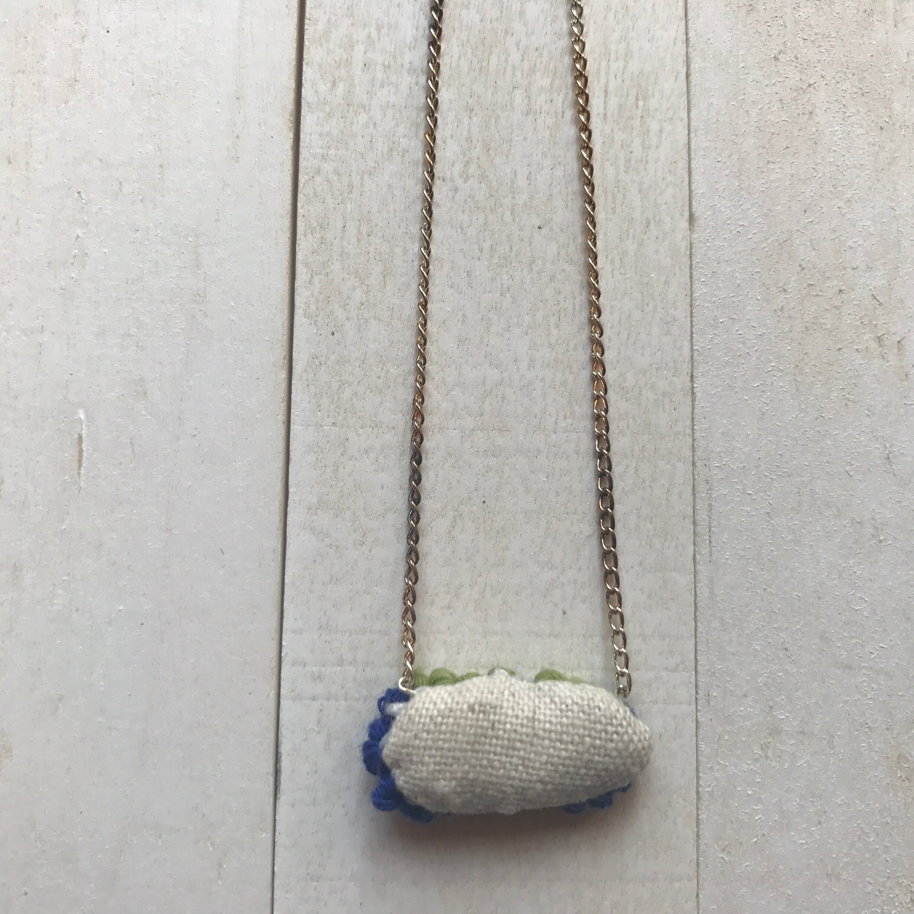 優しい味わいの手織りのペンダントトップが付いたネックレス。