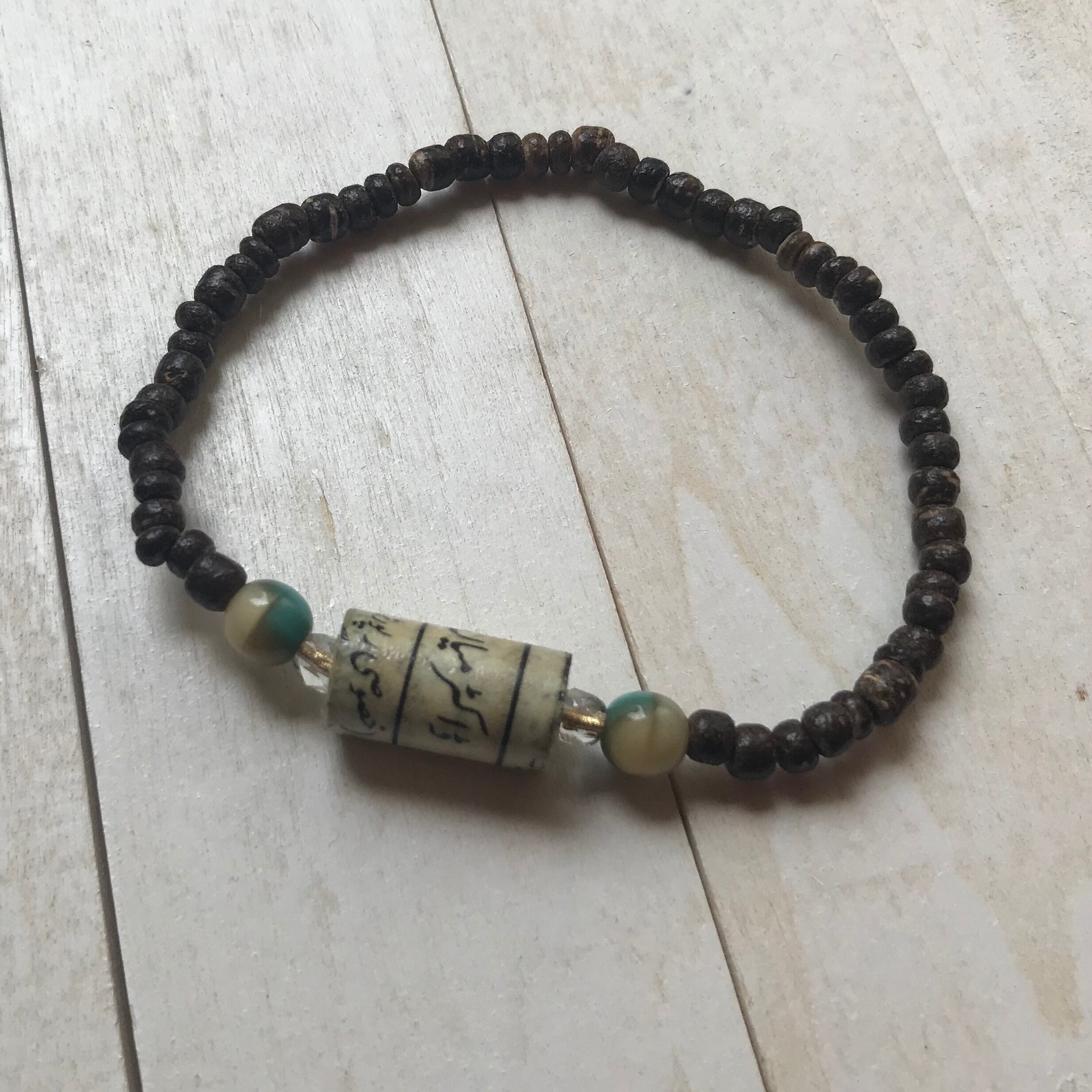 ペーパーミラクルズさんのペーパービーズに、ウッドビーズやチェコビーズを組み合わせて作りました。ゴムにビーズを通したタイプのブレスレットです。