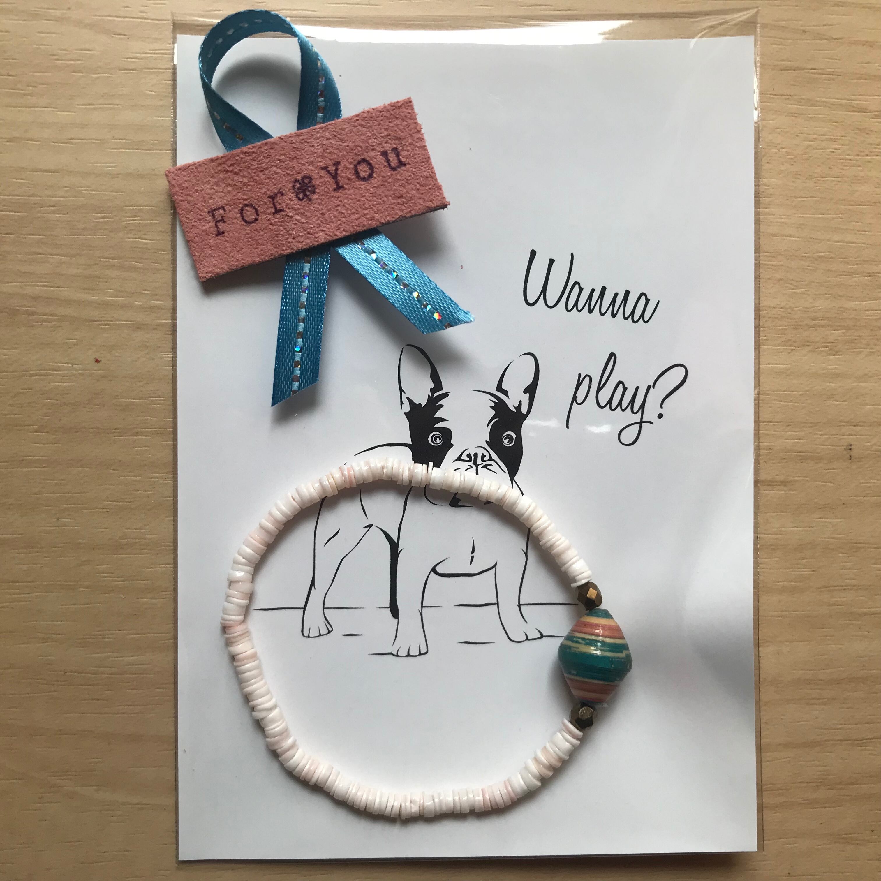 ペーパーミラクルズさんのペーパービーズに、チェコビーズや半貴石を組み合わせて作りました。ゴムにビーズを通したタイプのブレスレットです。