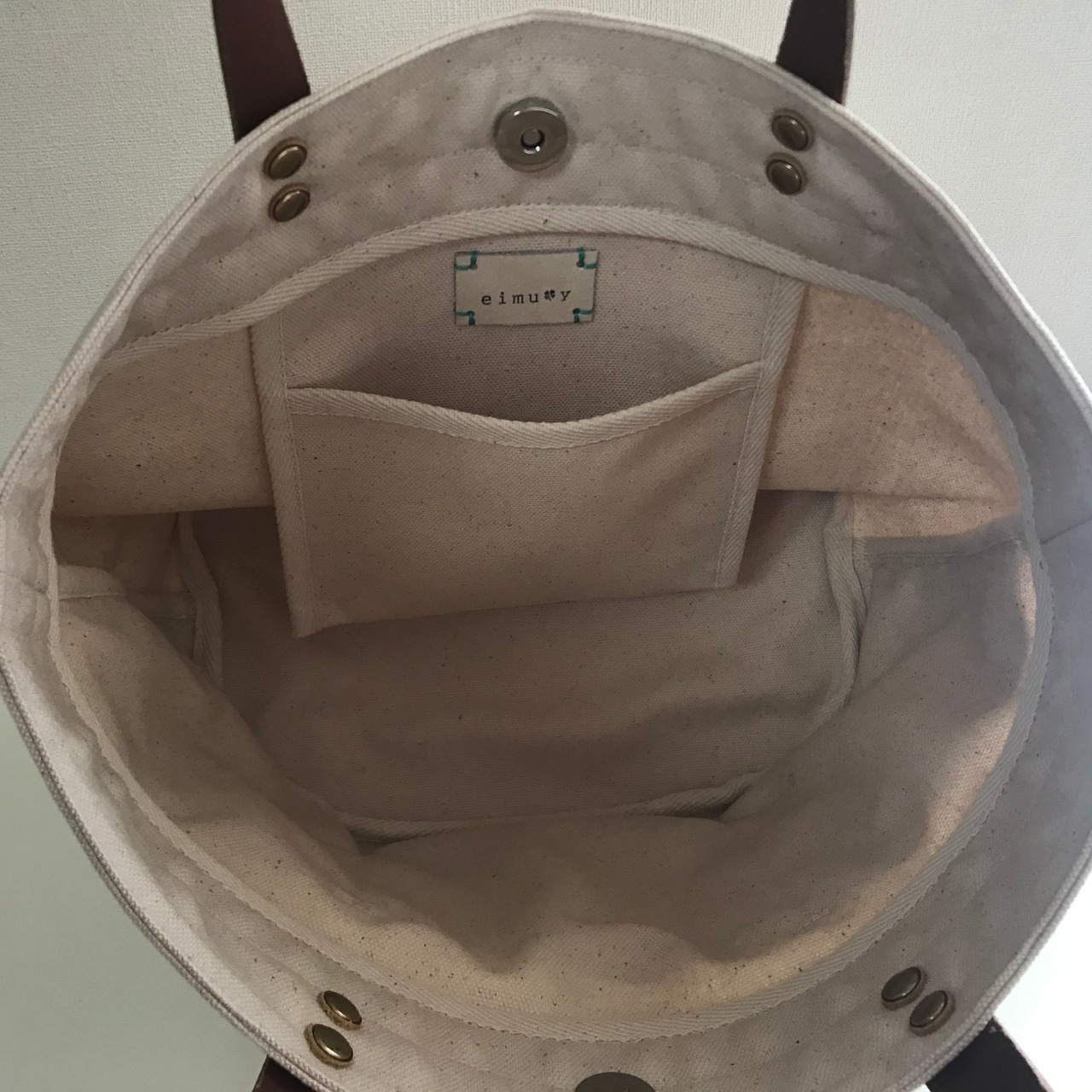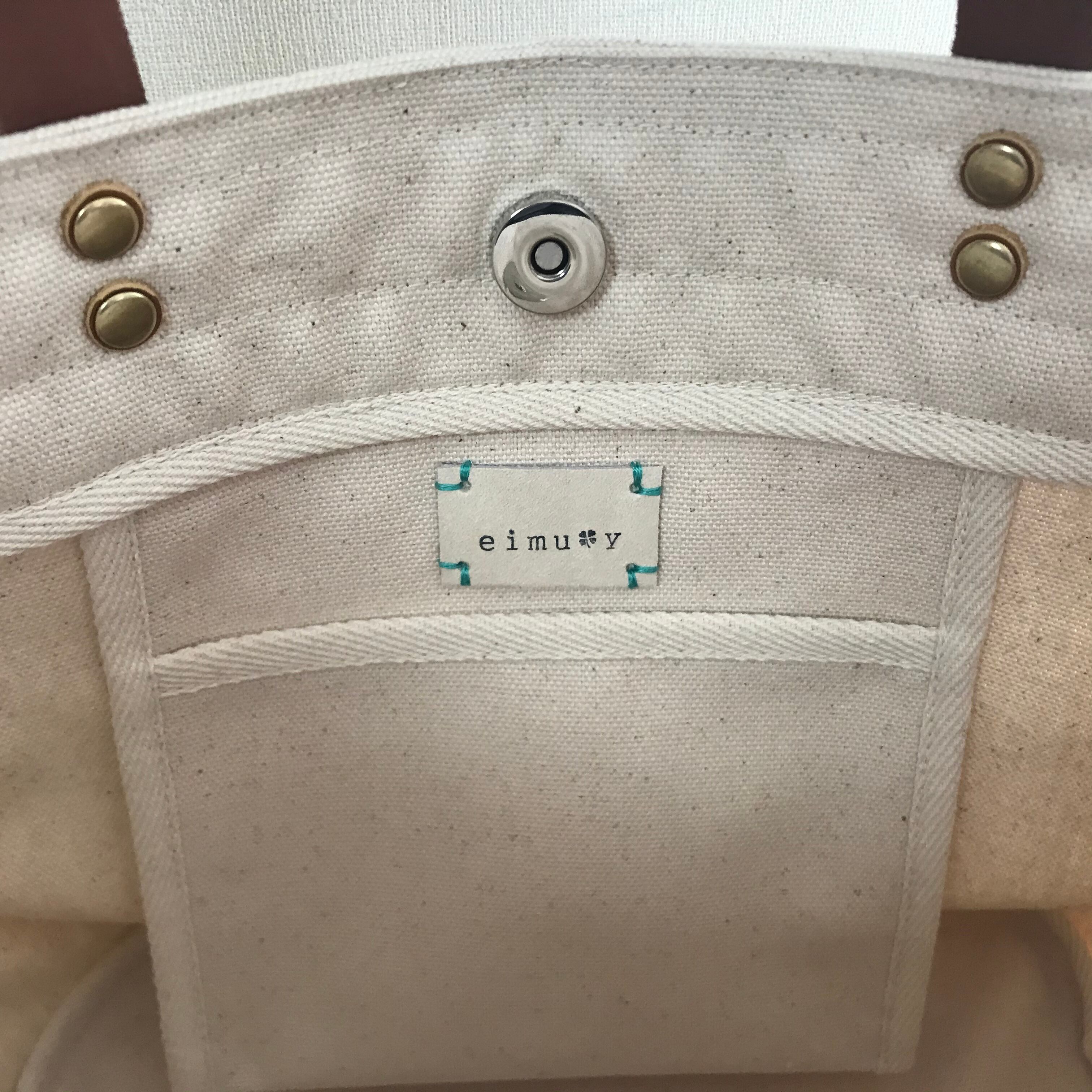 内ポケットについているeimuy革タグも、障がいのある方々にひとつひとつ手作りしてもらっています。