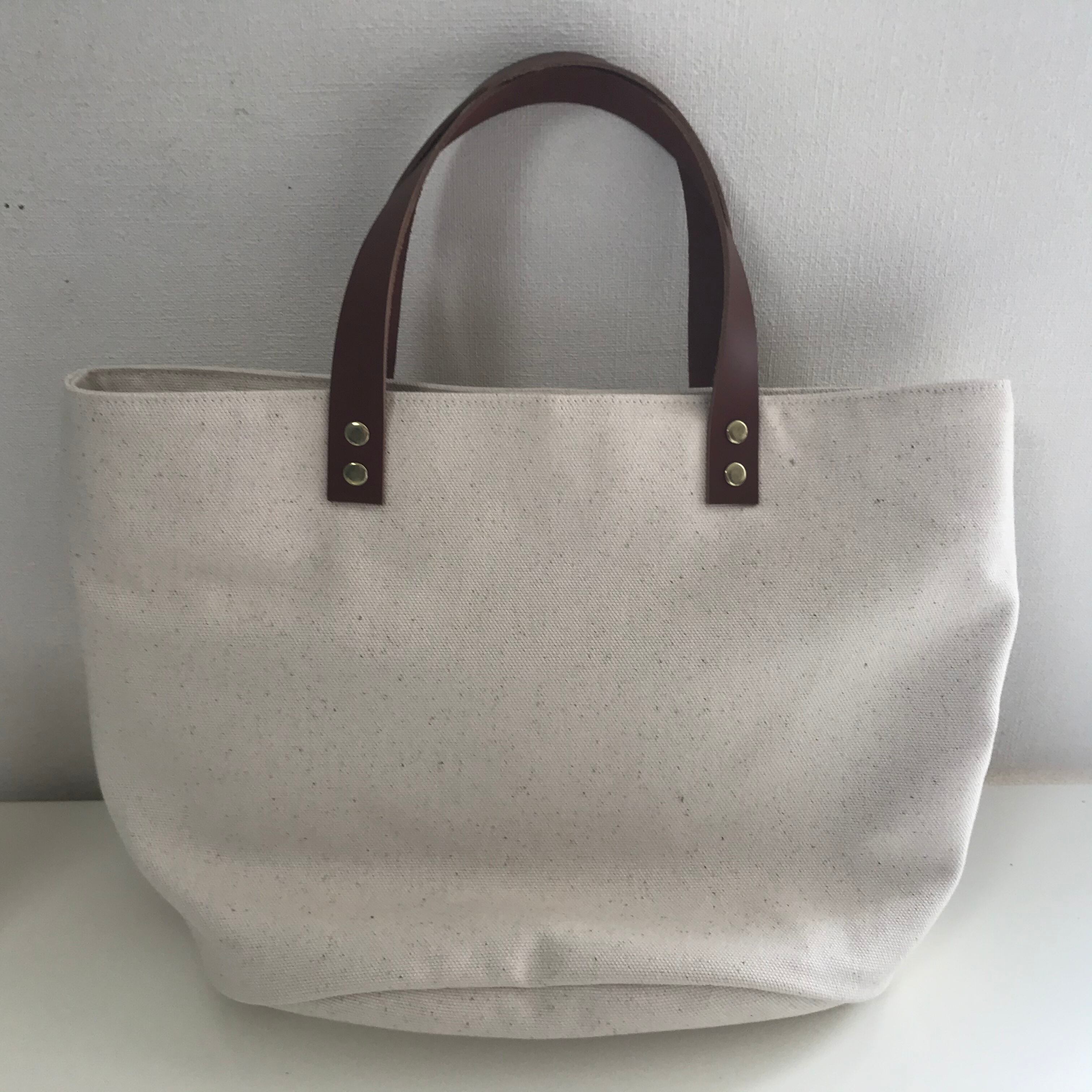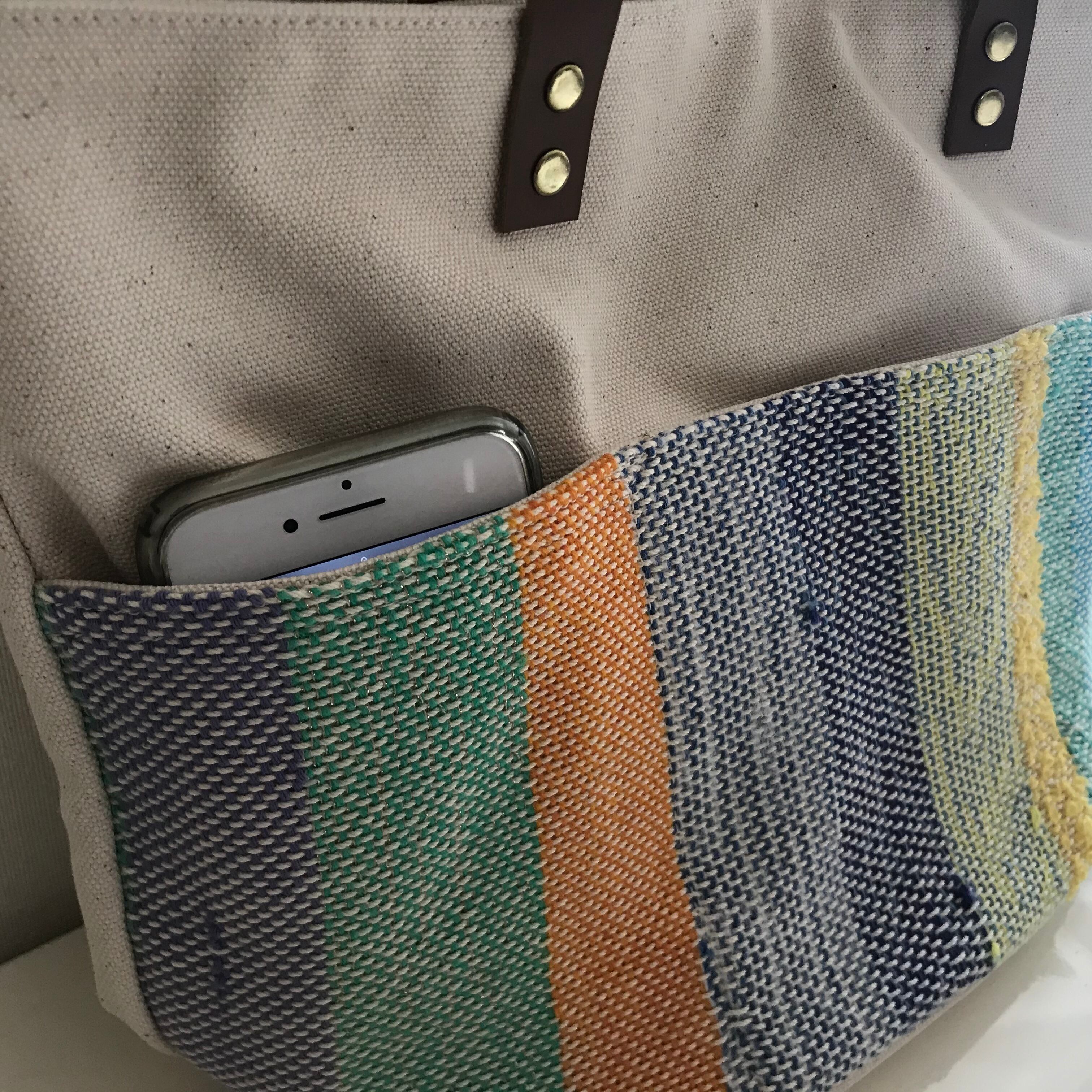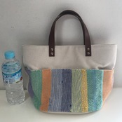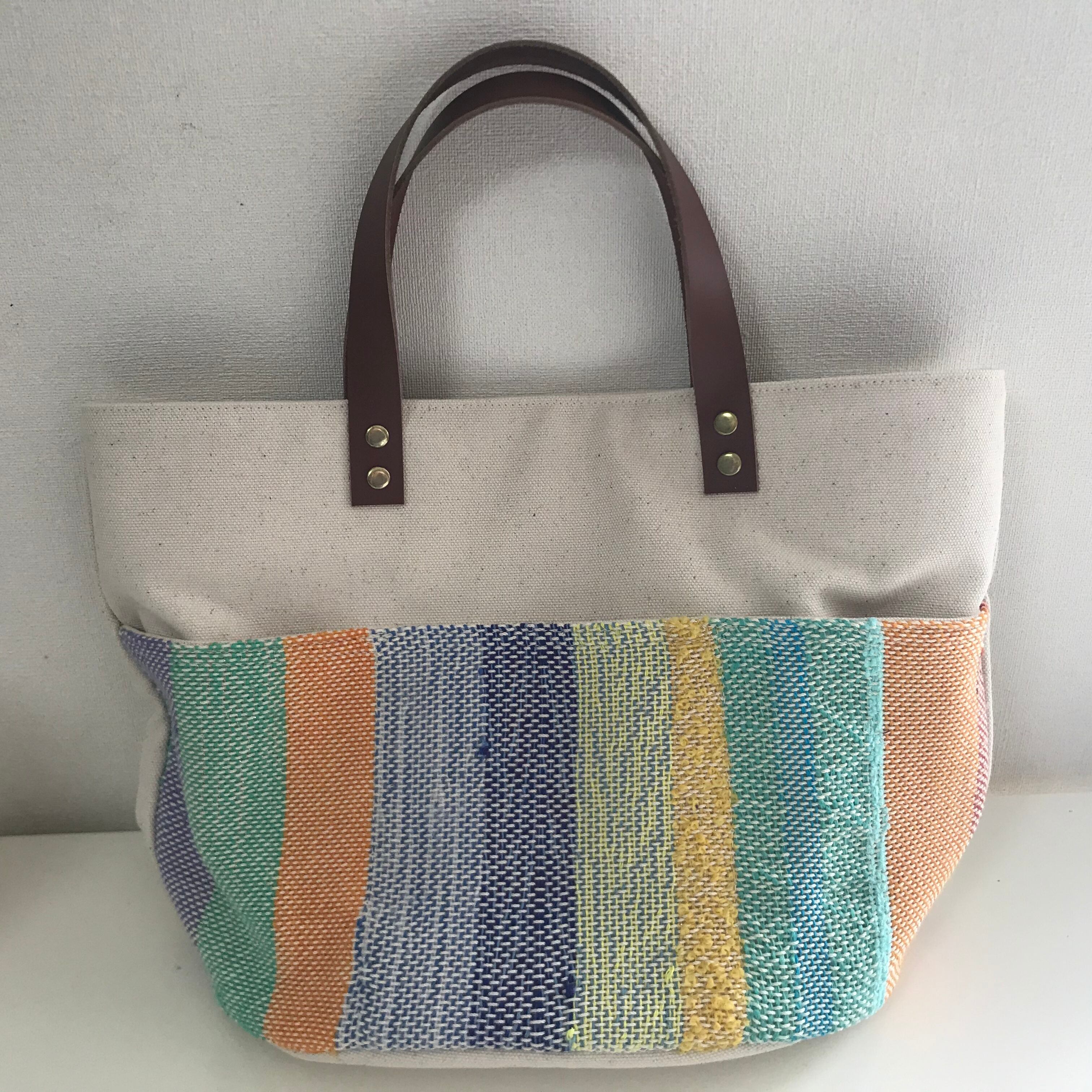 福祉作業所で障がいのある方々がこつこつと素敵に織り上げたさをり織りを使って作ったトートバッグです。