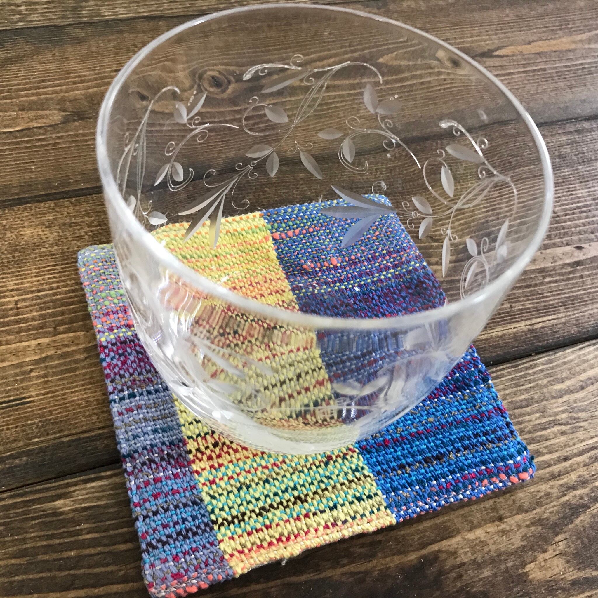こちらのコースターは、横浜市神奈川区のアトリエもくせいさんのさをり織りを使ってデザインしたオリジナルの一点物商品です。さをり織りと帆布のリバーシブルでお使いいただけます。