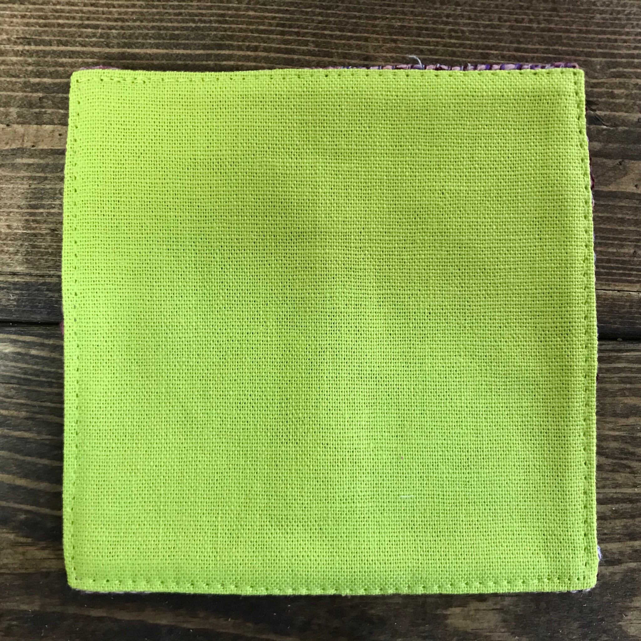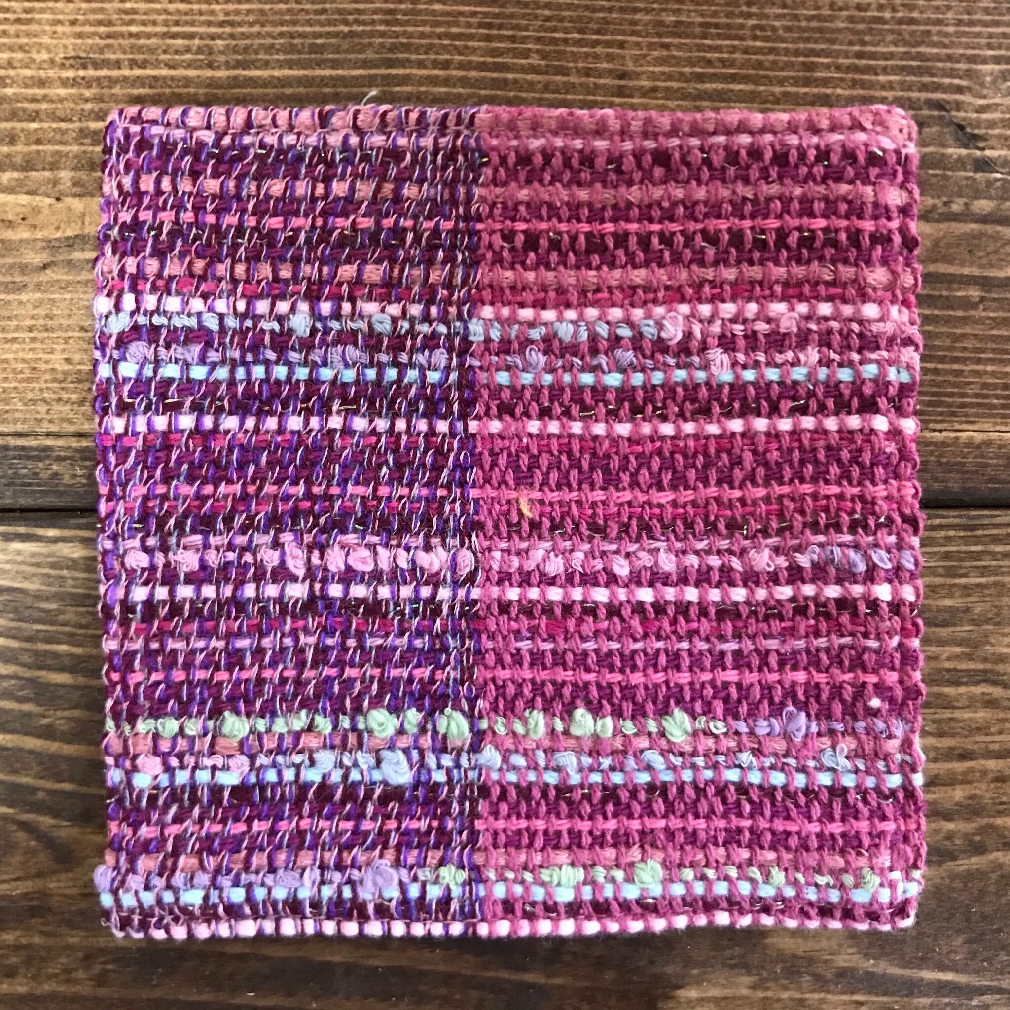 こちらのコースターは、横浜市神奈川区のアトリエもくせいさんのさをり織りを使ってデザインしたオリジナルの一点物商品です。さをり織りと帆布のリバーシブルでお使いいただけます。