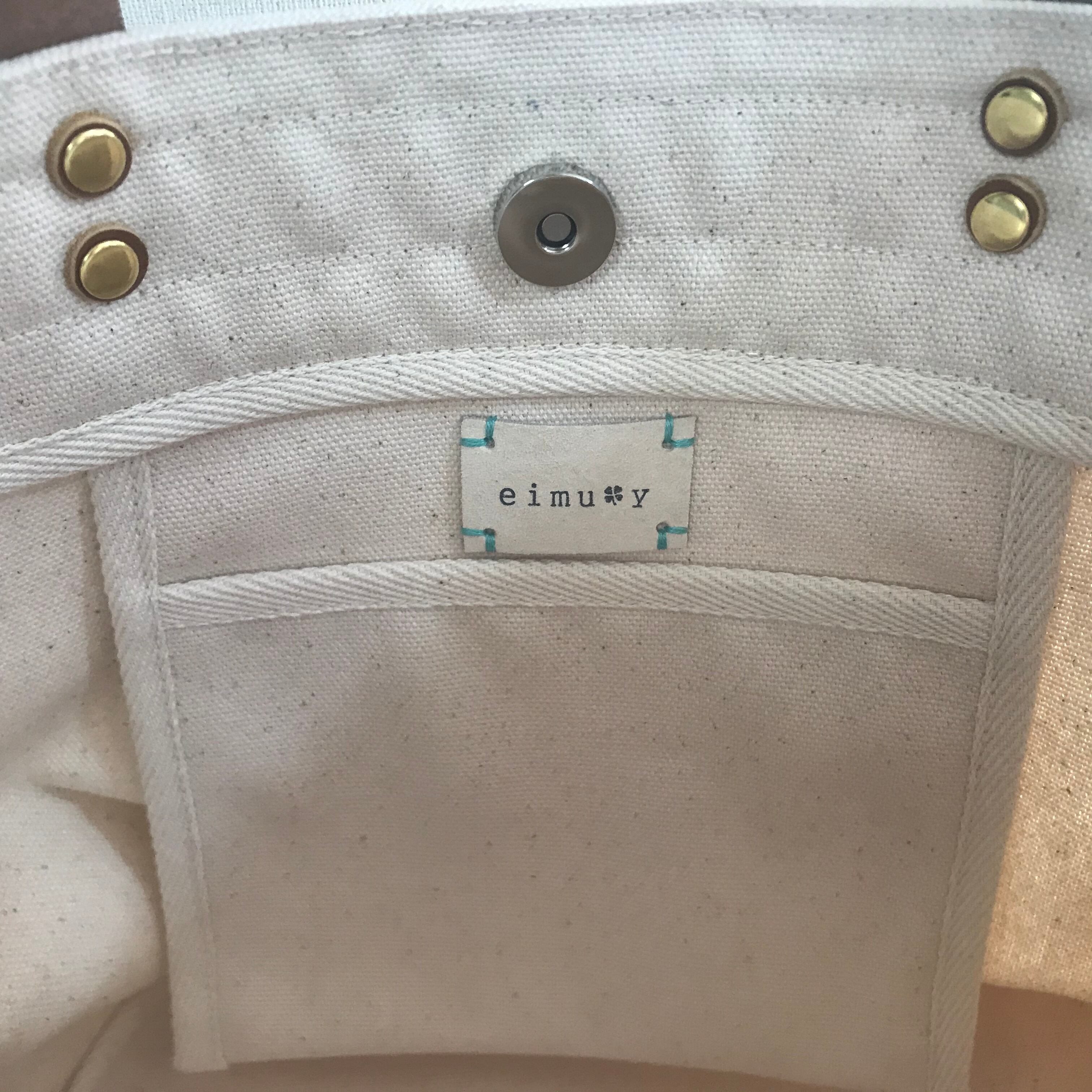 内ポケットについているeimuy革タグも、障がいのある方々にひとつひとつ手作りしてもらっています。
