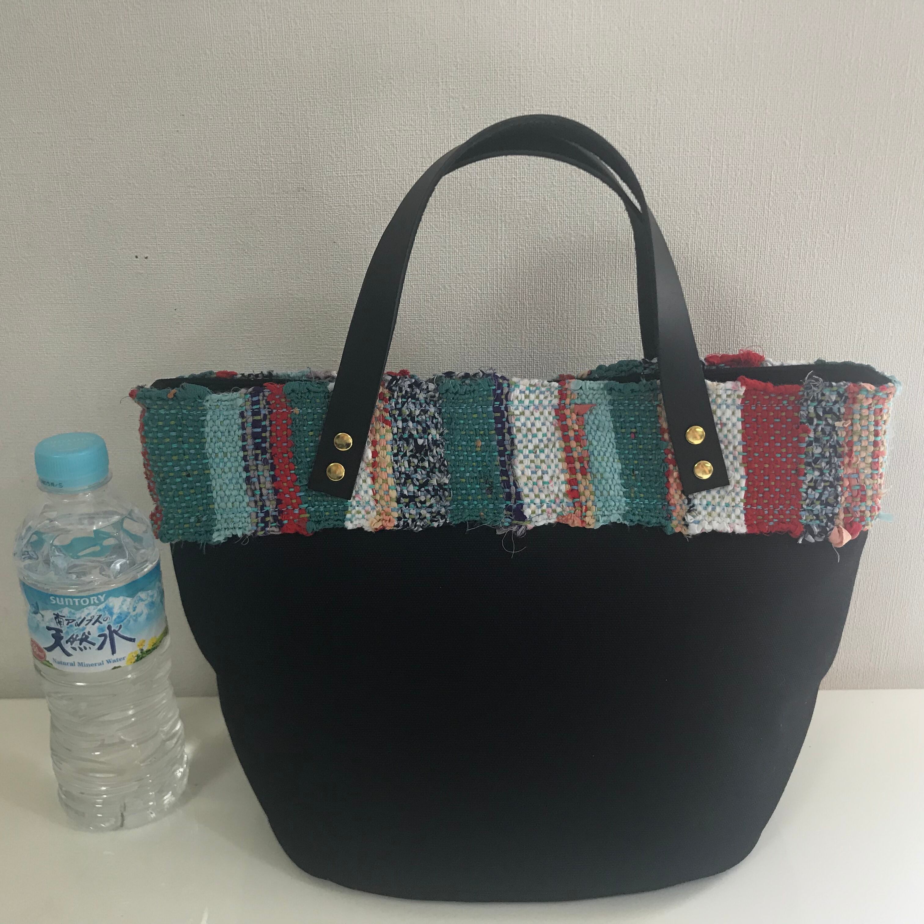 横浜市港北区のアートかれんさんで障がいのある方々がこつこつと素敵に織り上げた裂き織りを使って作ったトートバッグです。