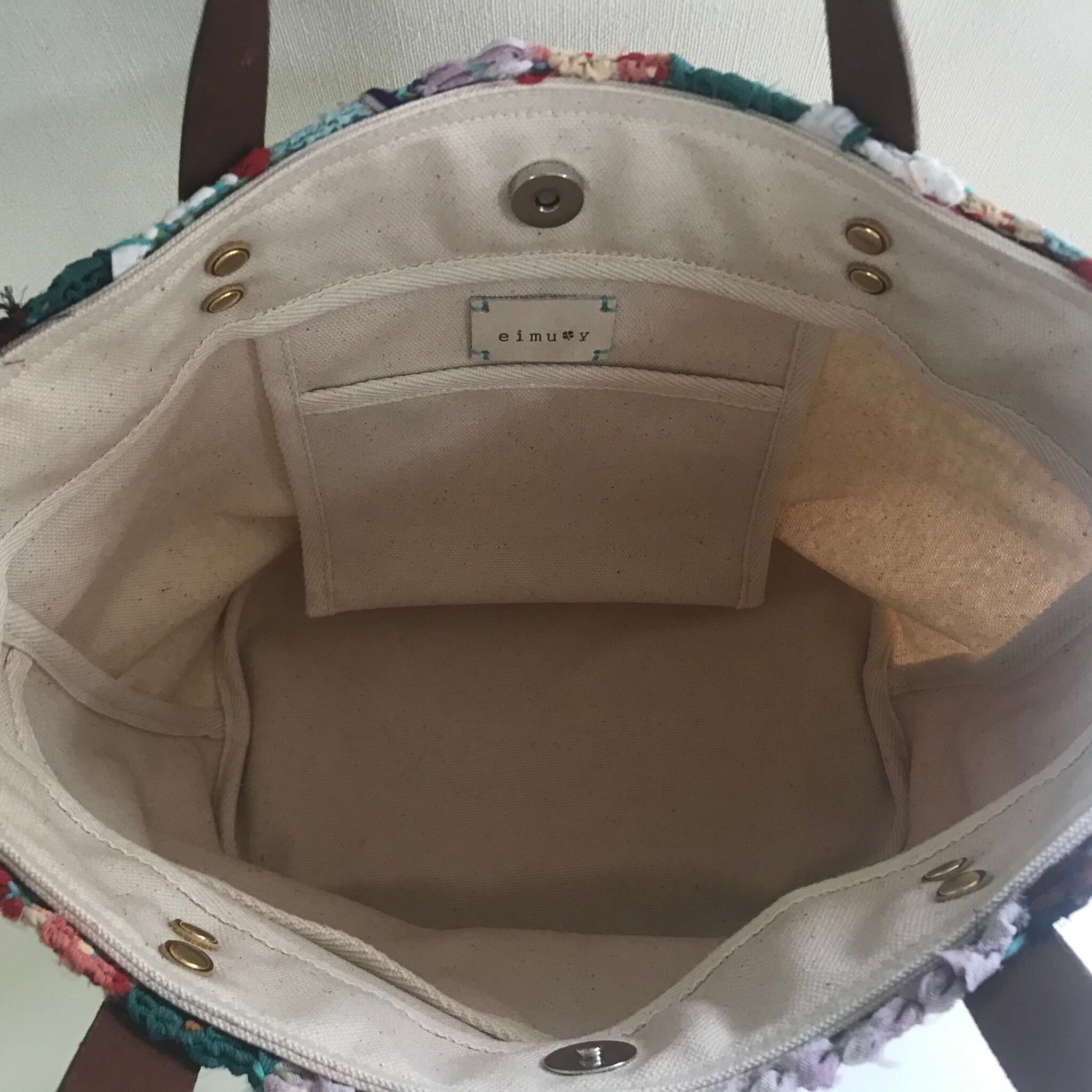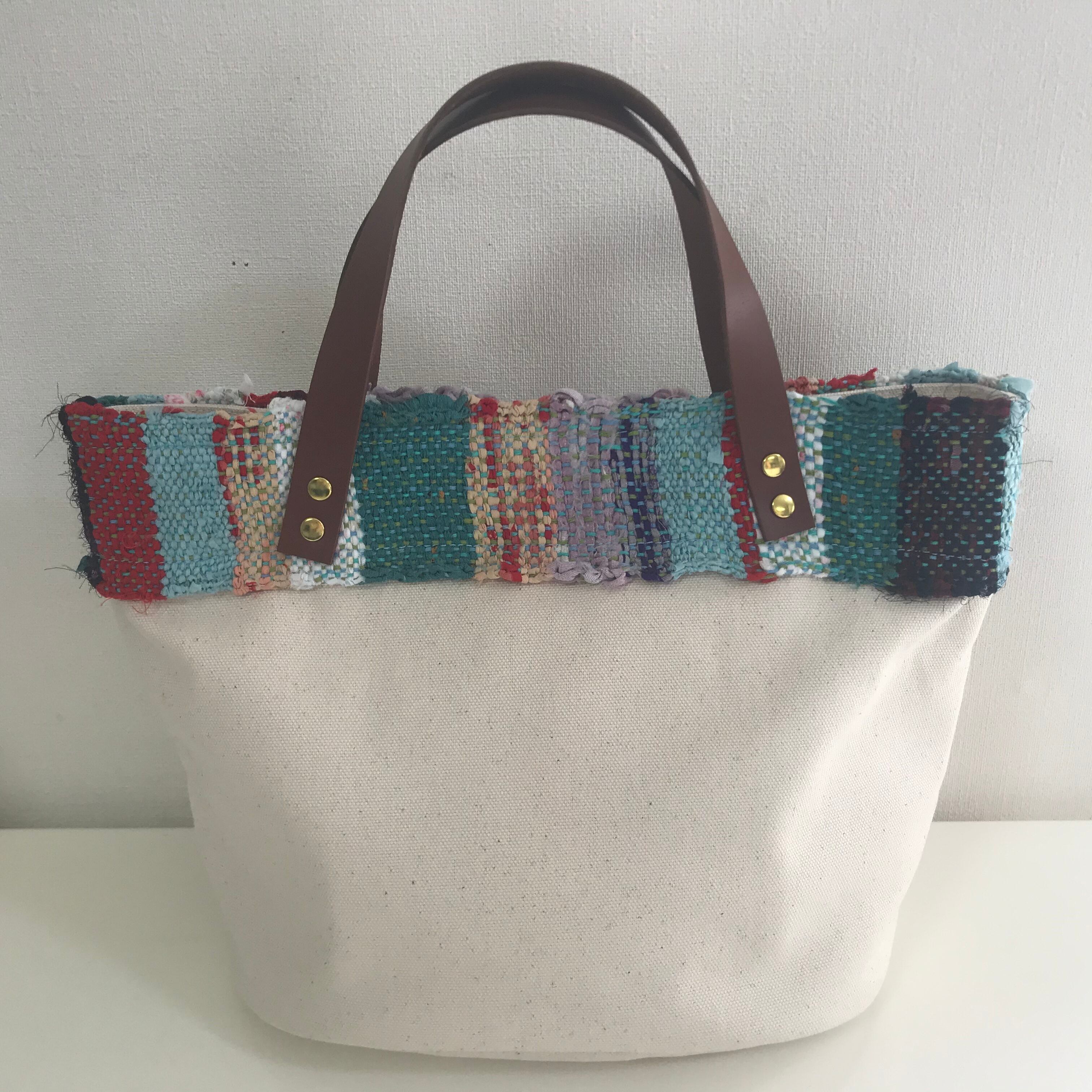 横浜市港北区のアートかれんさんで障がいのある方々がこつこつと素敵に織り上げた裂き織りを使って作ったトートバッグです。