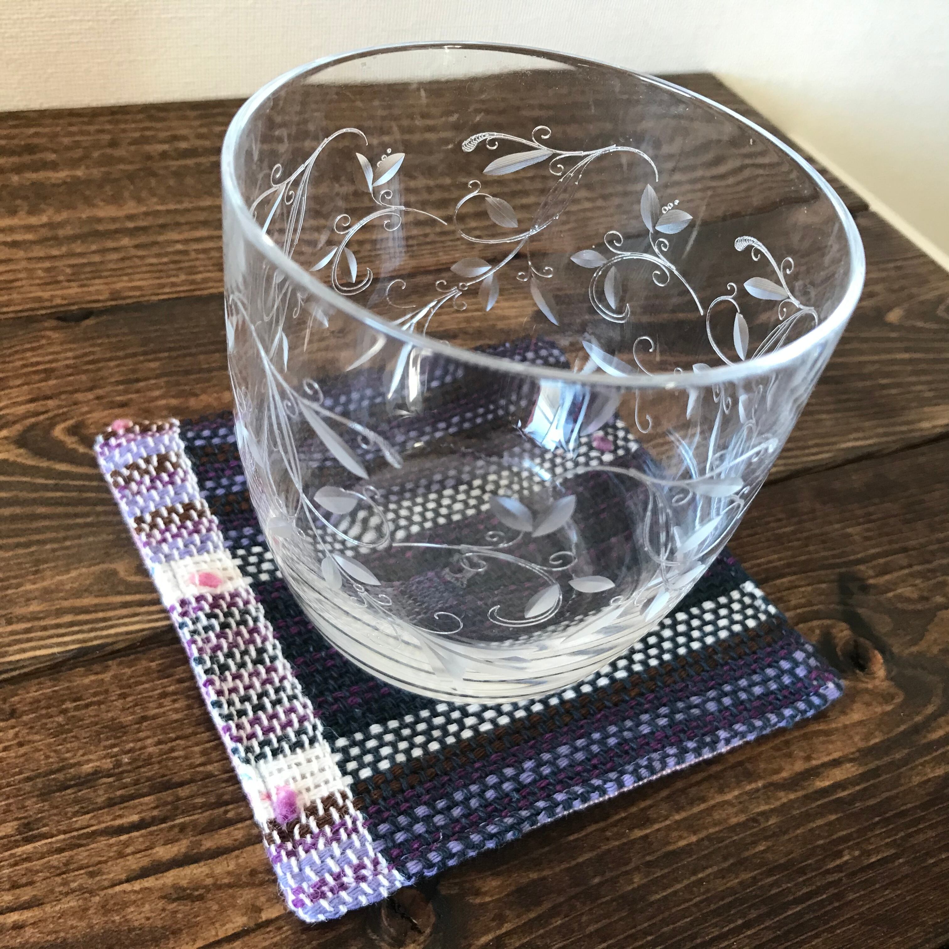 こちらのコースターは、福祉作業所で障害のある方が織り上げた素敵なさをり織りを使ってデザインしたオリジナルの一点物商品です。さをり織りと帆布のリバーシブルでお使いいただけます。