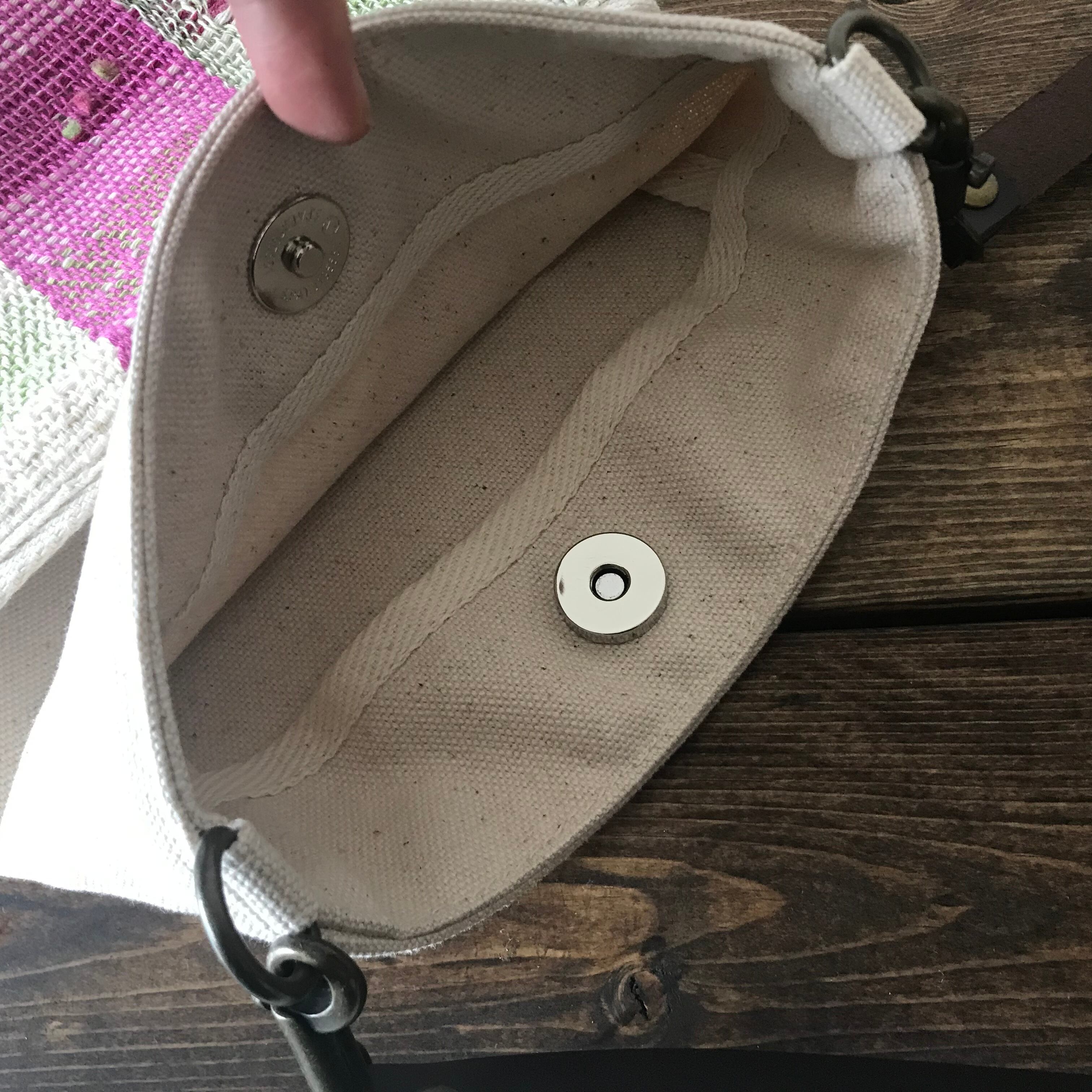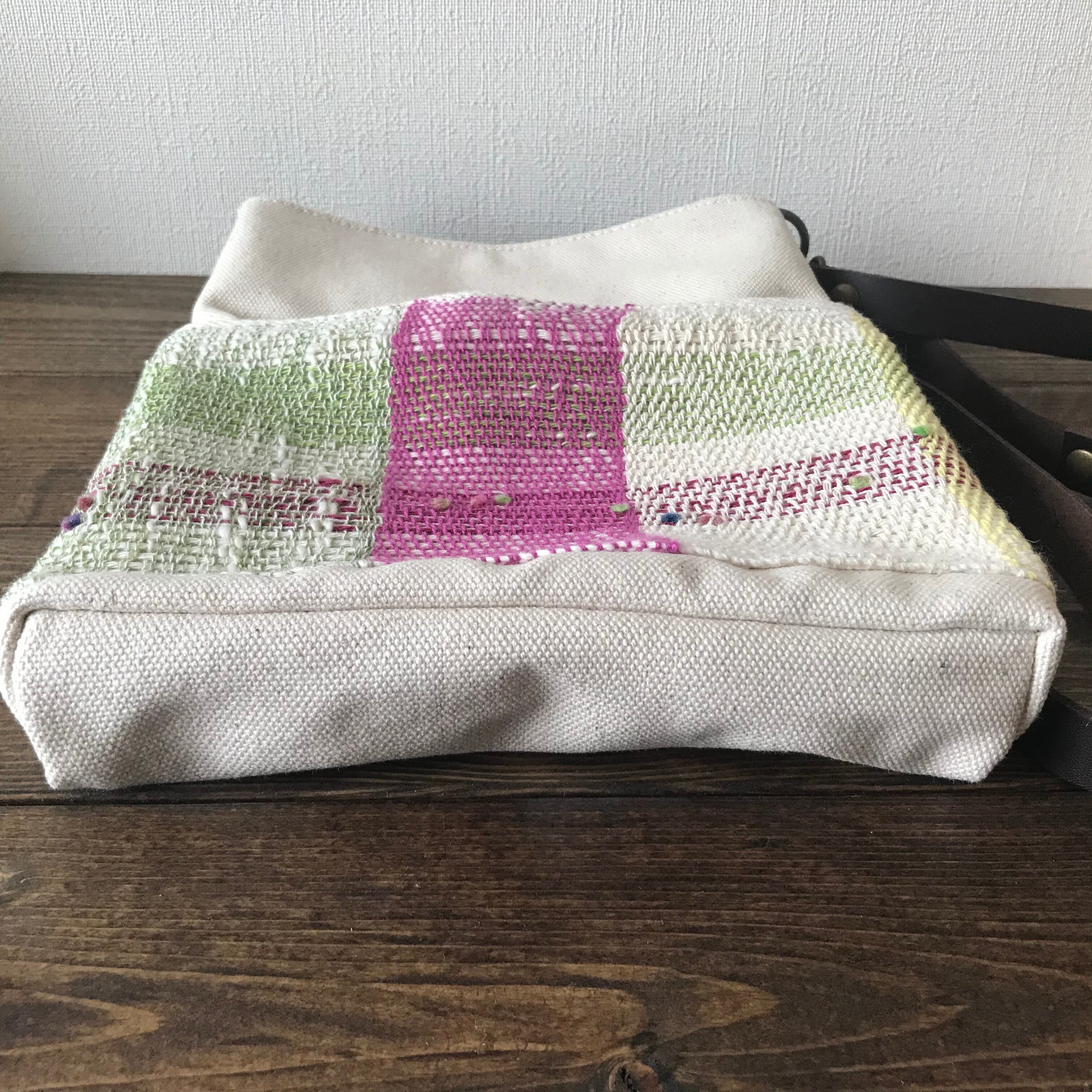 こちらのポシェットは、外側のポケット部分に福祉作業所のさをり織りを使ってデザインしたオリジナルの一点物商品です。