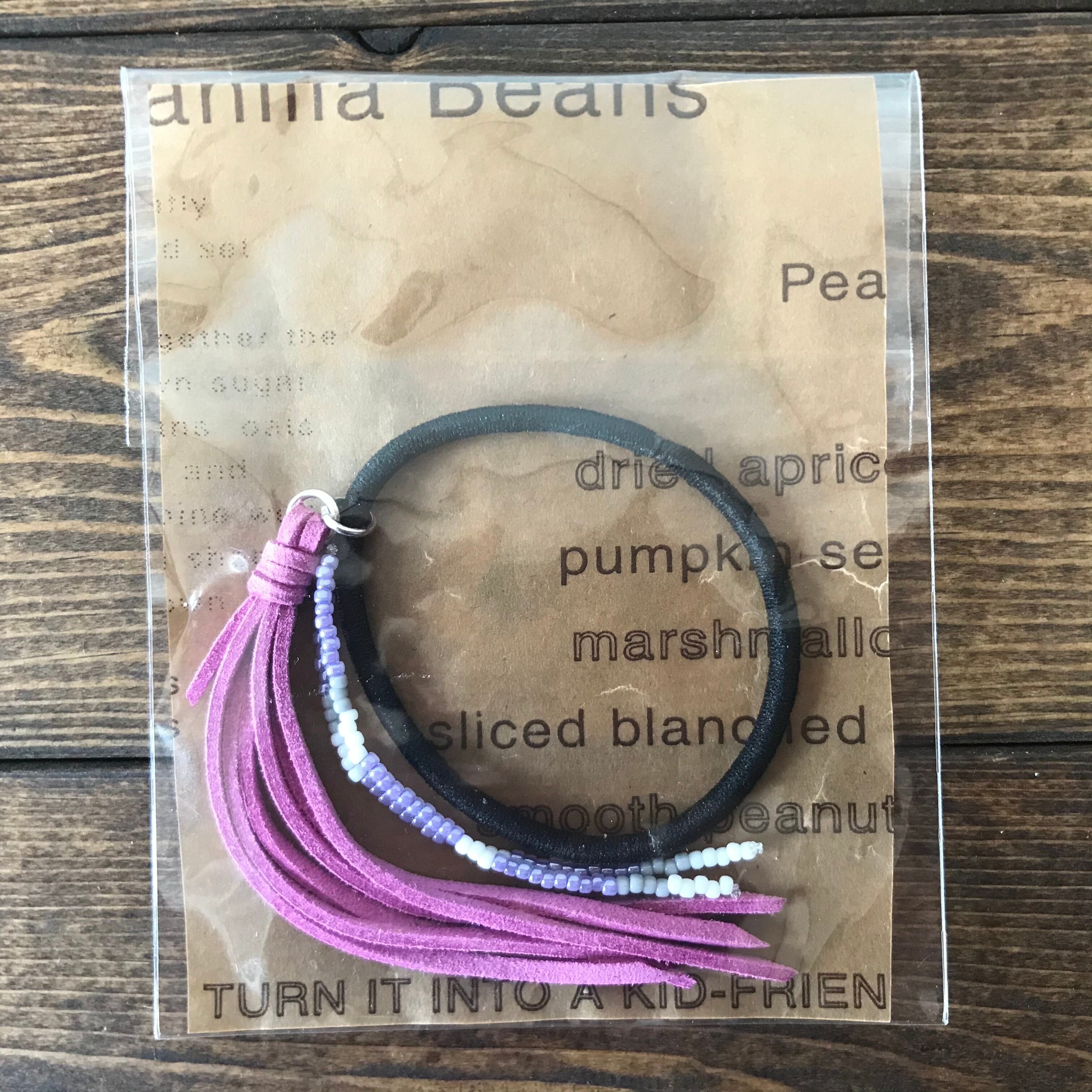 スウェードのフリンジとビーズを組み合わせて作ったおしゃれな髪ゴムです。