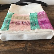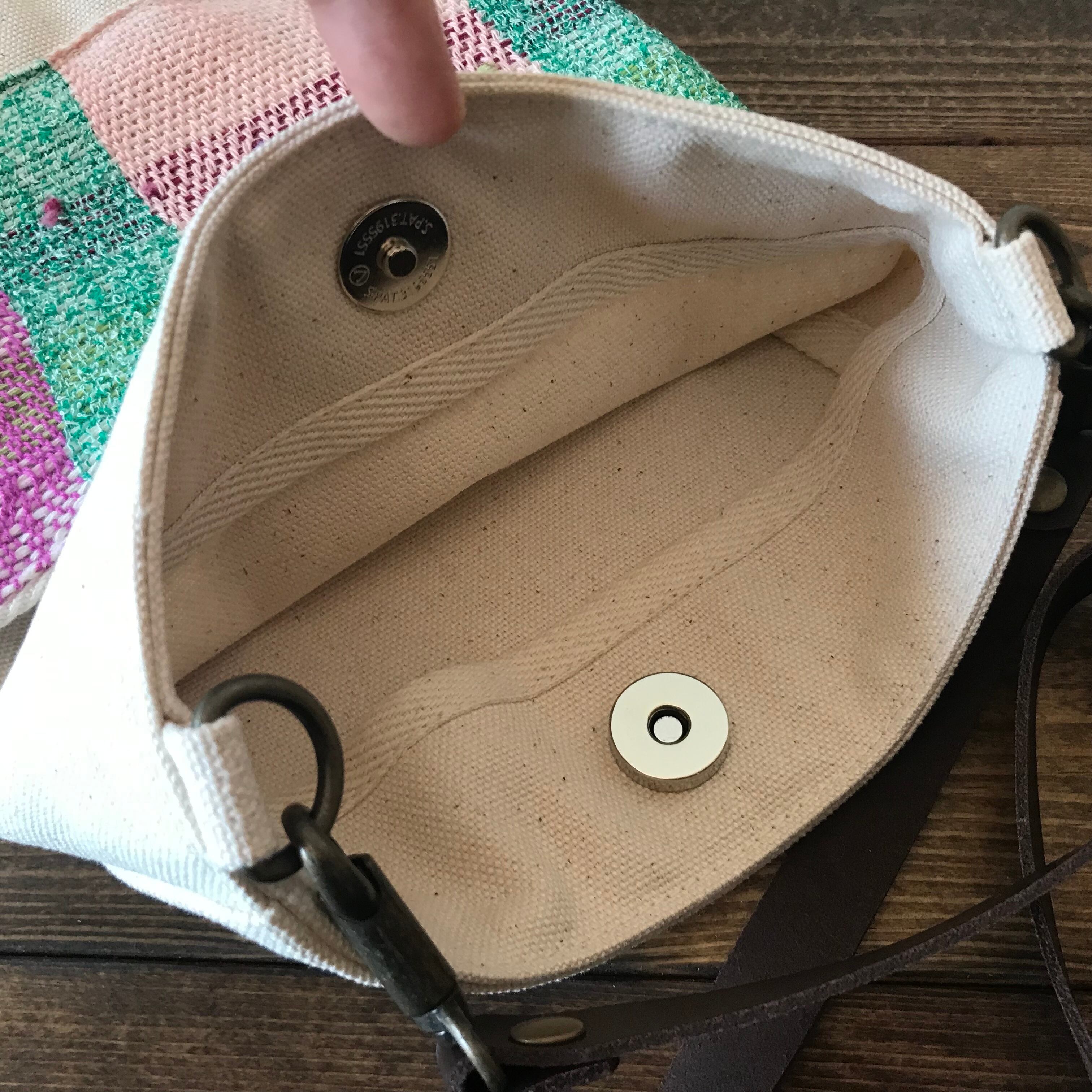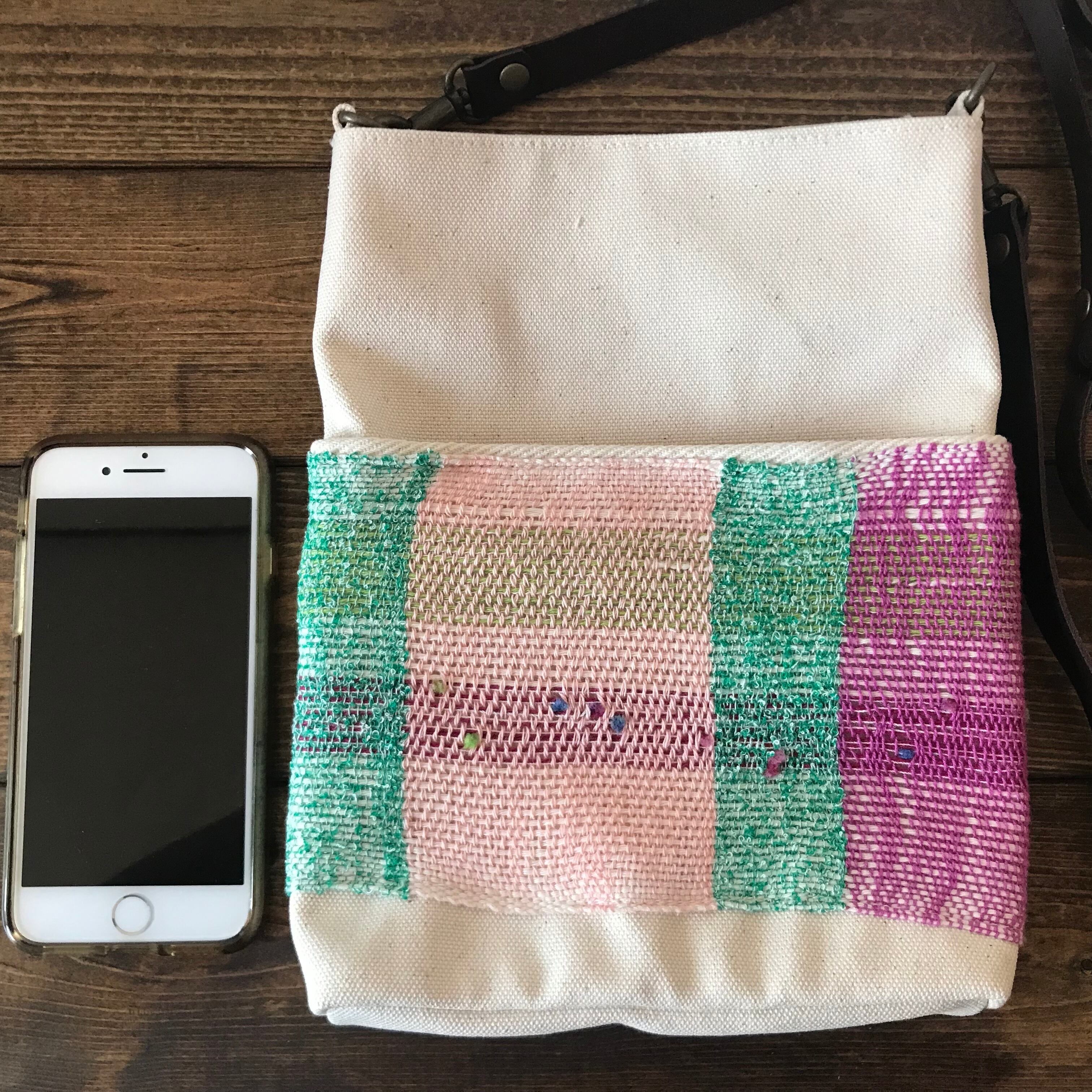 こちらのポシェットは、外側のポケット部分に福祉作業所で障がいのある方々が素敵に織り上げたさをり織りを使ってデザインしたオリジナルの一点物商品です。