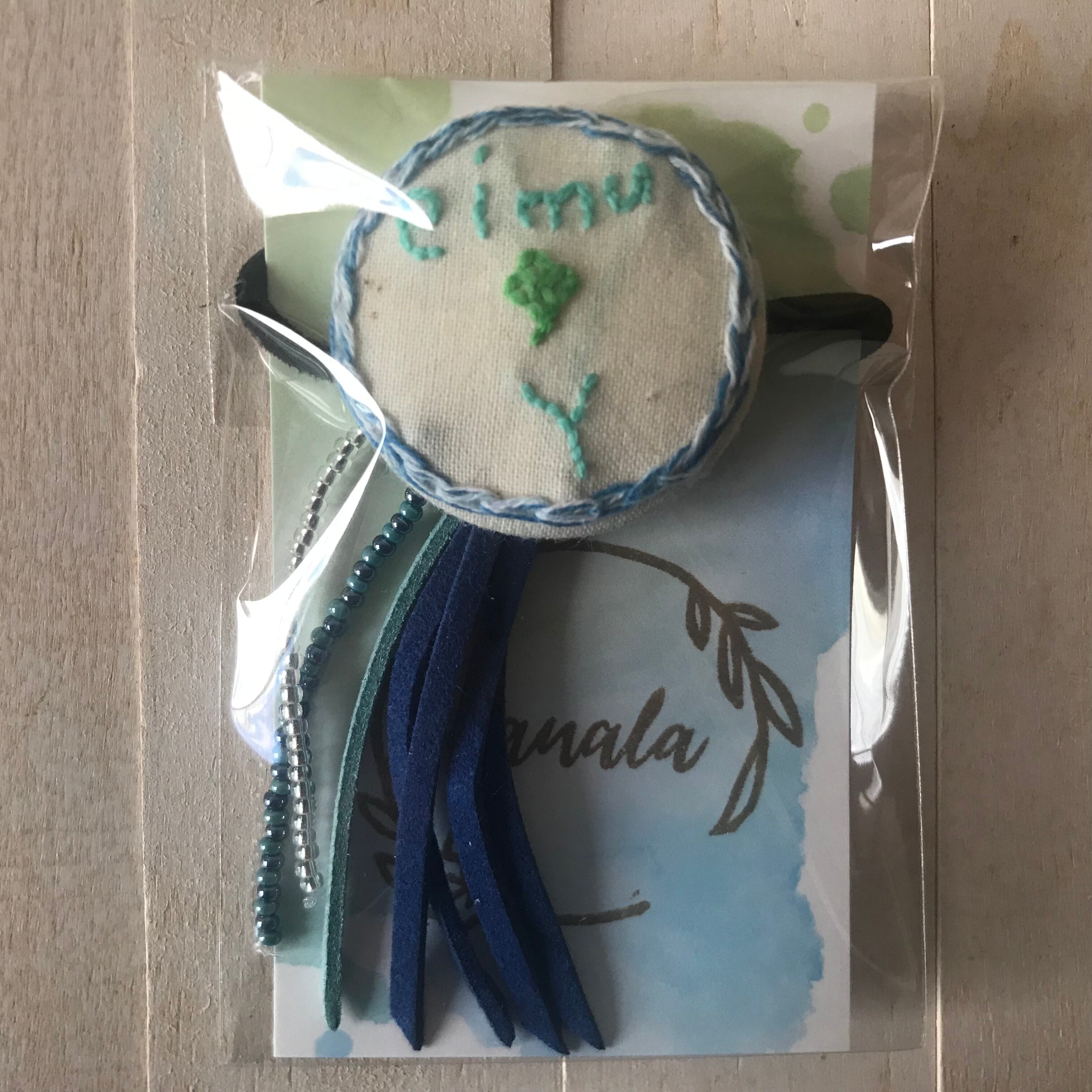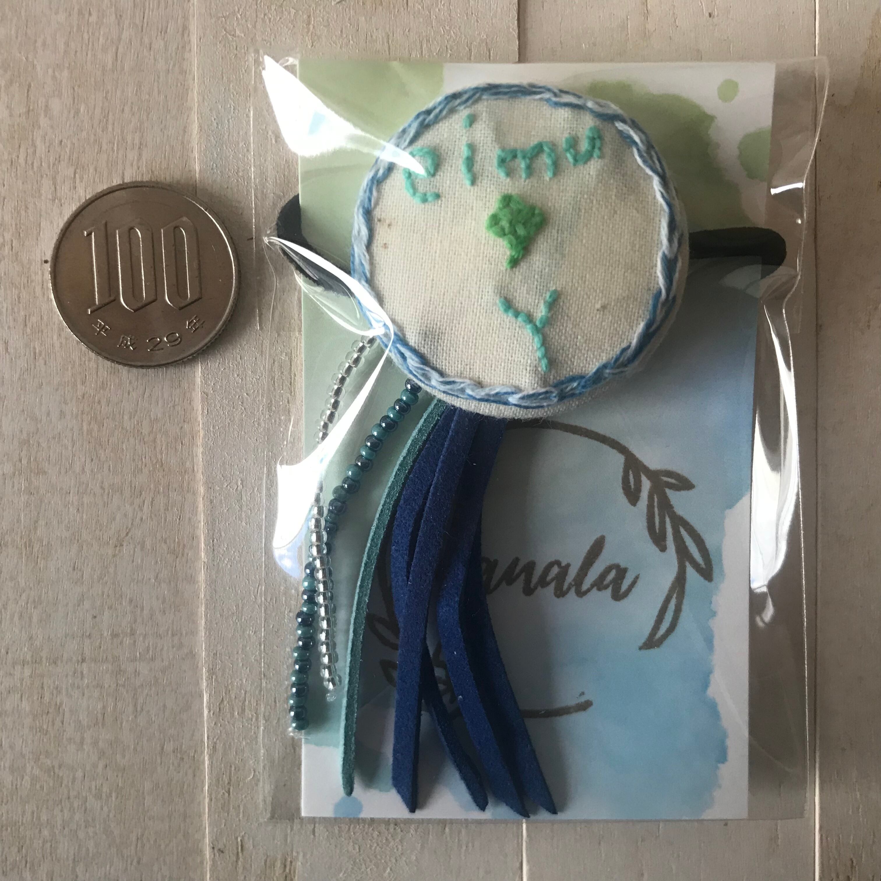 eimuyのロゴを刺繍してもらったオリジナルのヘアゴムです。