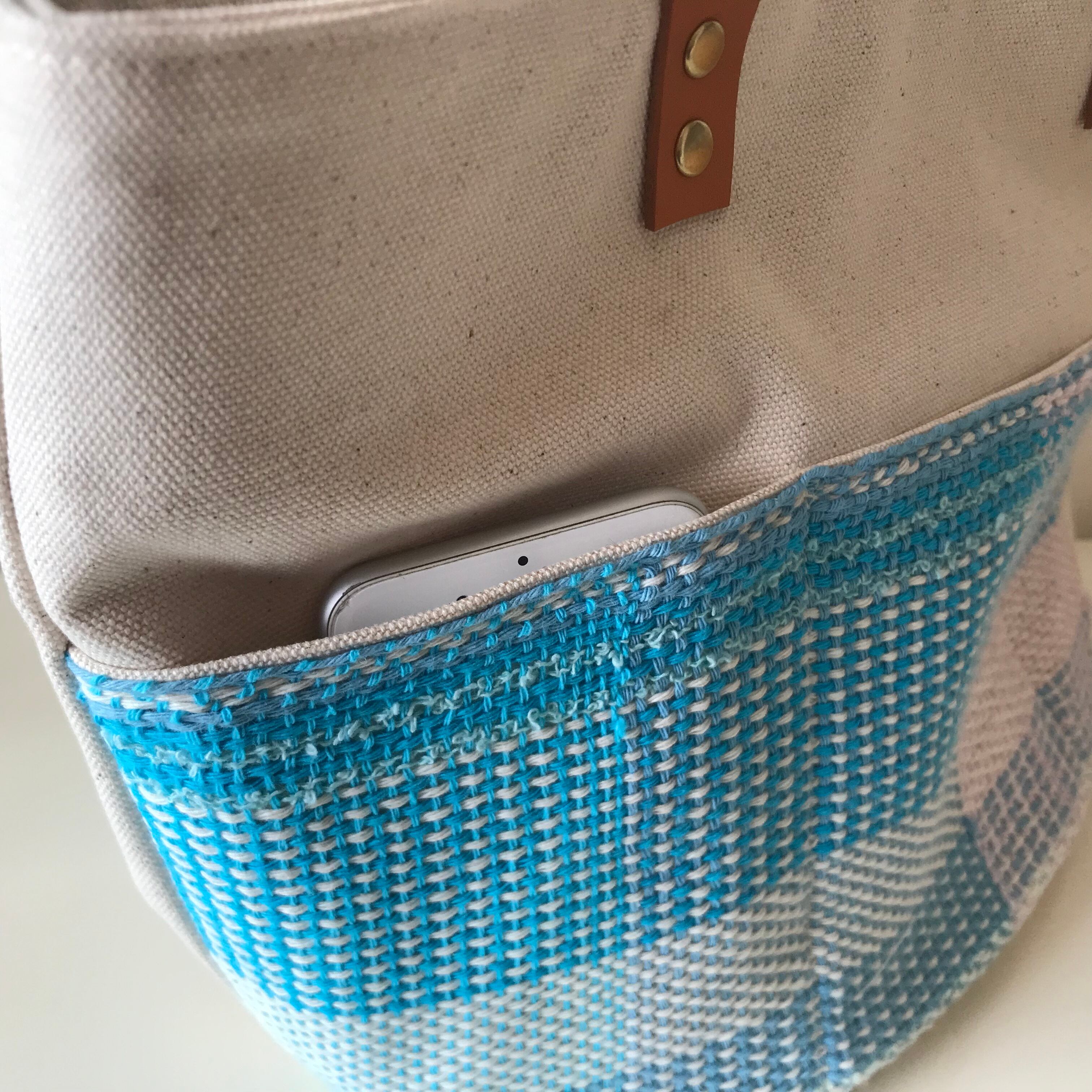 福祉作業所で障がいのある方々がこつこつと素敵に織り上げたさをり織りを使って作ったトートバッグです。