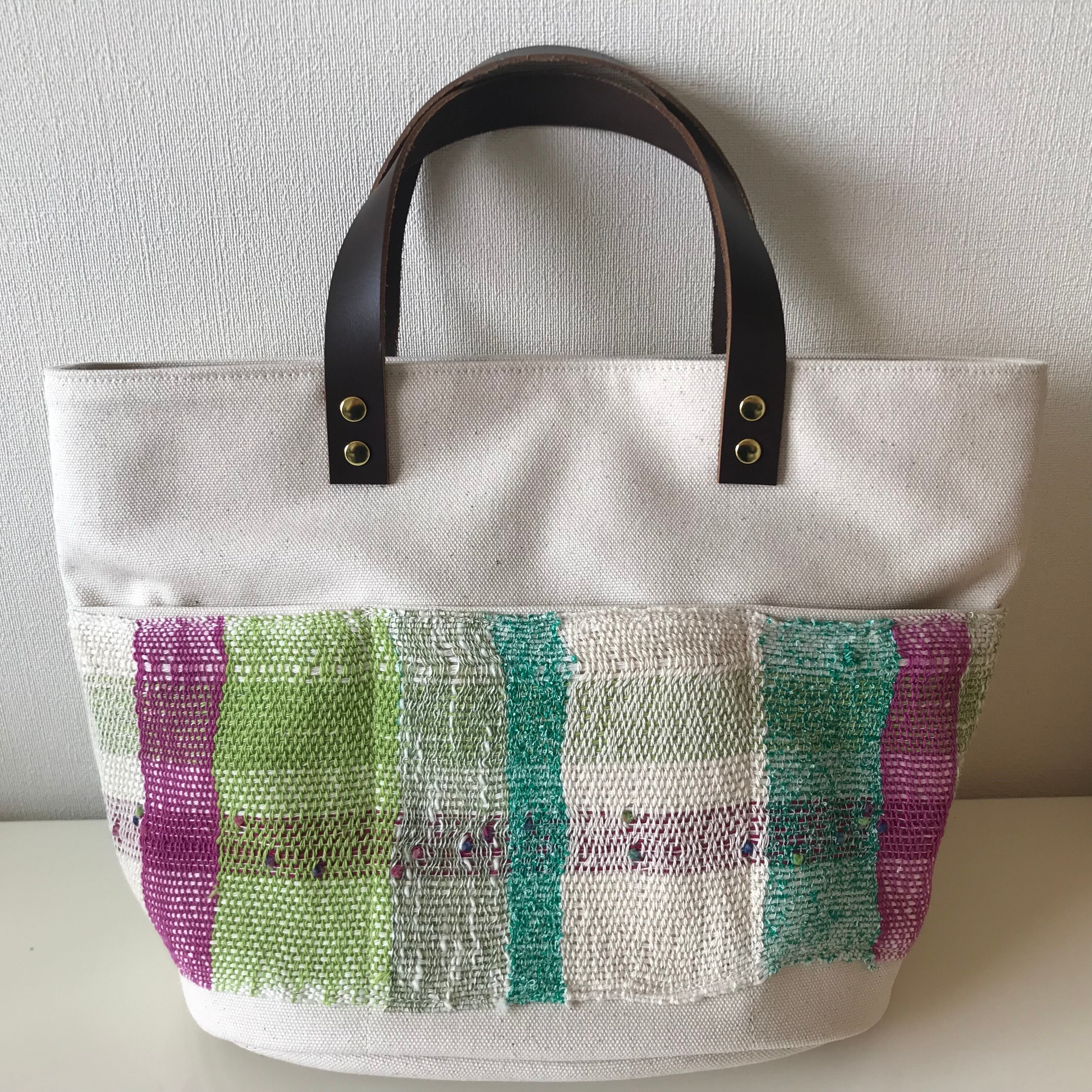 福祉作業所で障がいのある方々がこつこつと素敵に織り上げたさをり織りを使って作ったトートバッグです。