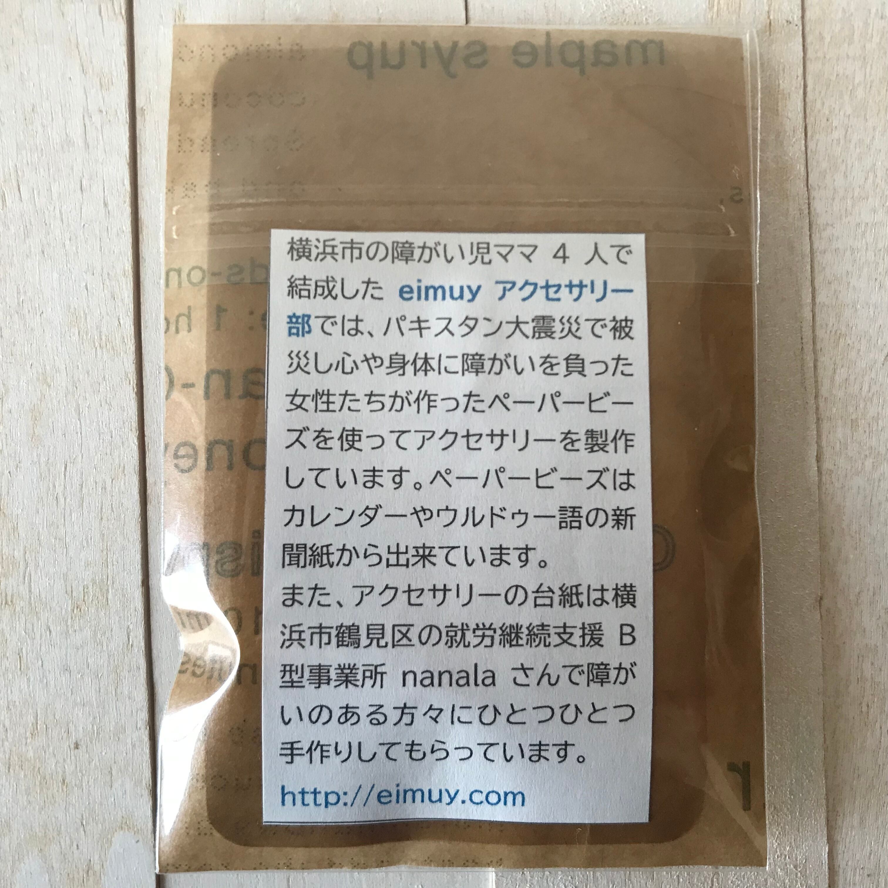 アクセサリーの台紙は、横浜市鶴見区の就労継続支援B型事業所nanalaさんで障がいのある方々にひとつひとつ手作りしてもらいました。