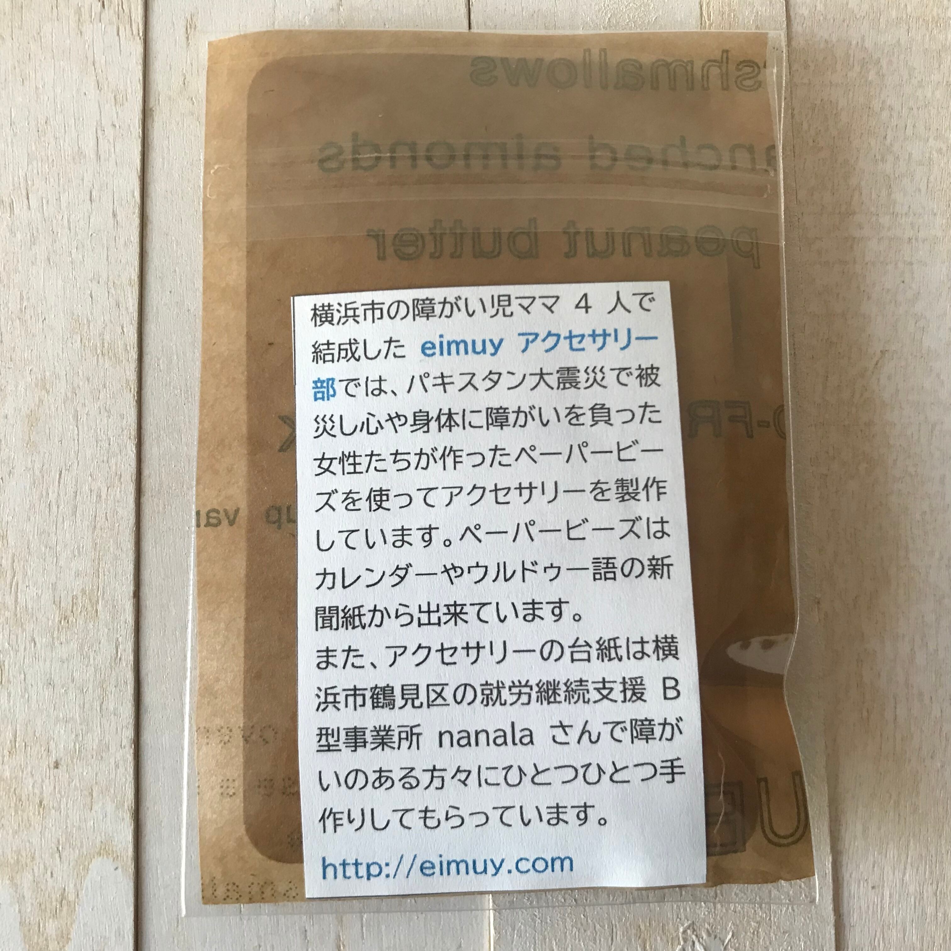 アクセサリーの台紙は、横浜市鶴見区の就労継続支援B型事業所nanalaさんで障がいのある方々にひとつひとつ手作りしてもらいました。