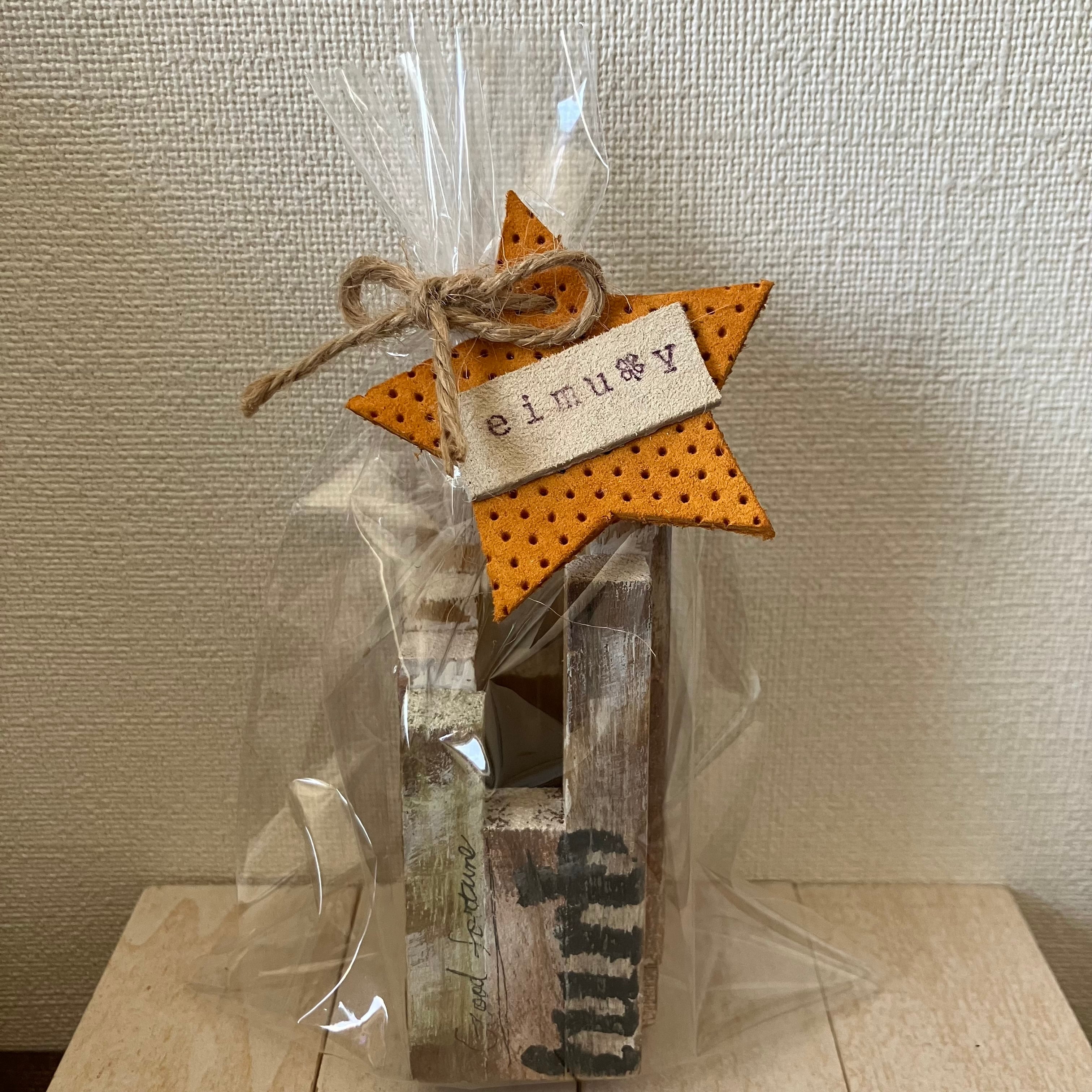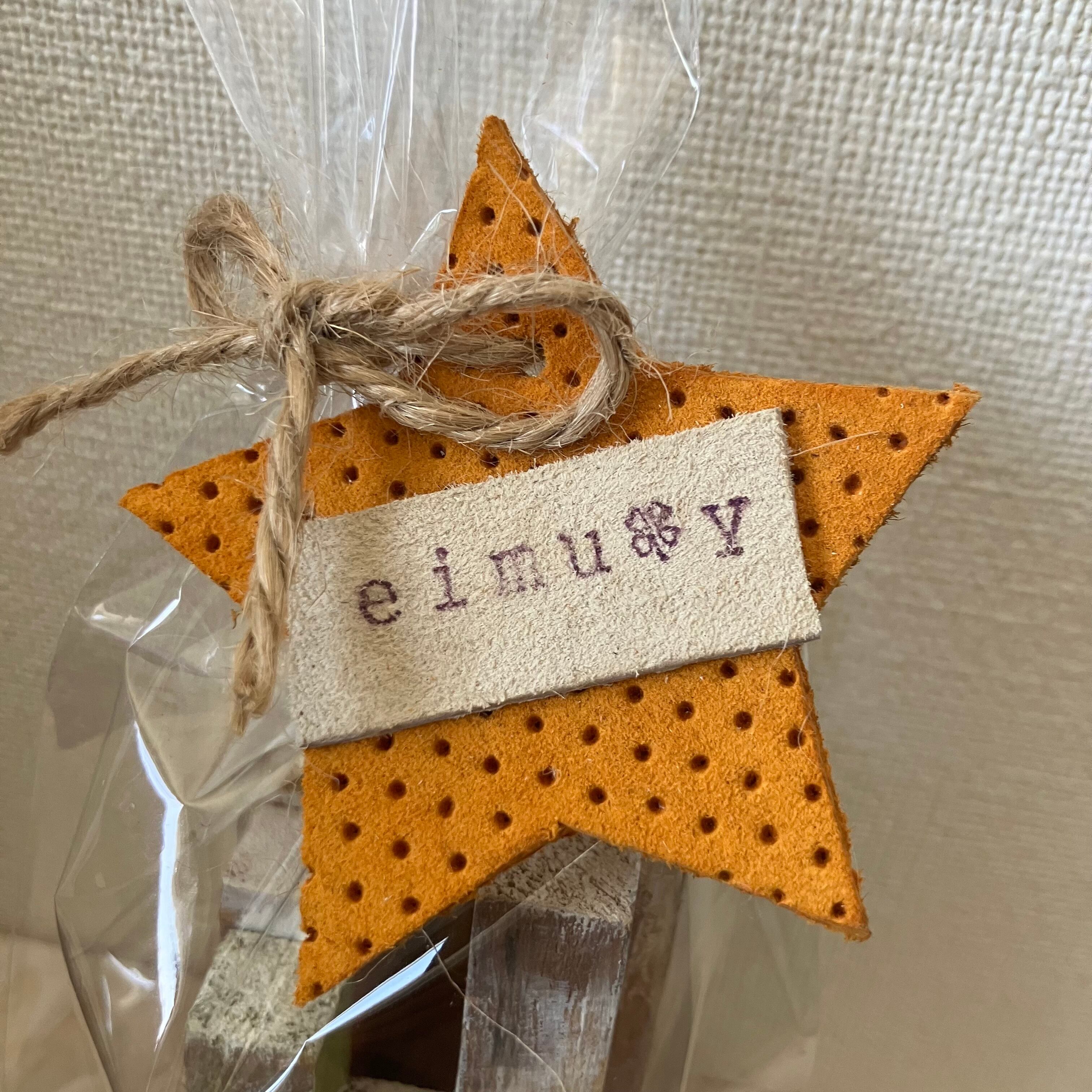 ラッピングに使っている星形の革タグも障がいのある方々に「革を切る」「スタンプを押す」「穴を開ける」という作業を練習していただき、ひとつひとつ手作りしてもらいました。