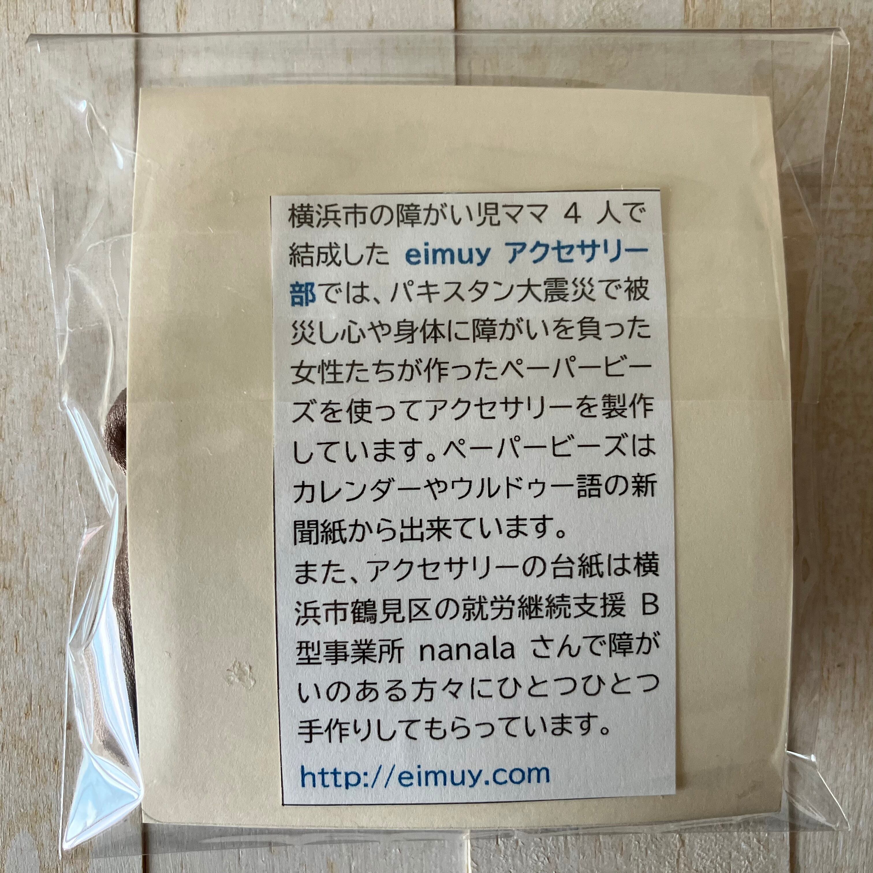 横浜市の障がい児ママ4人で結成したeimuyアクセサリー部では、2005年のパキスタン大震災で被災し心や体に障がいを持ちながら施設で暮らす女性たちが作ったペーパービーズを使ってアクセサリーを製作しています。