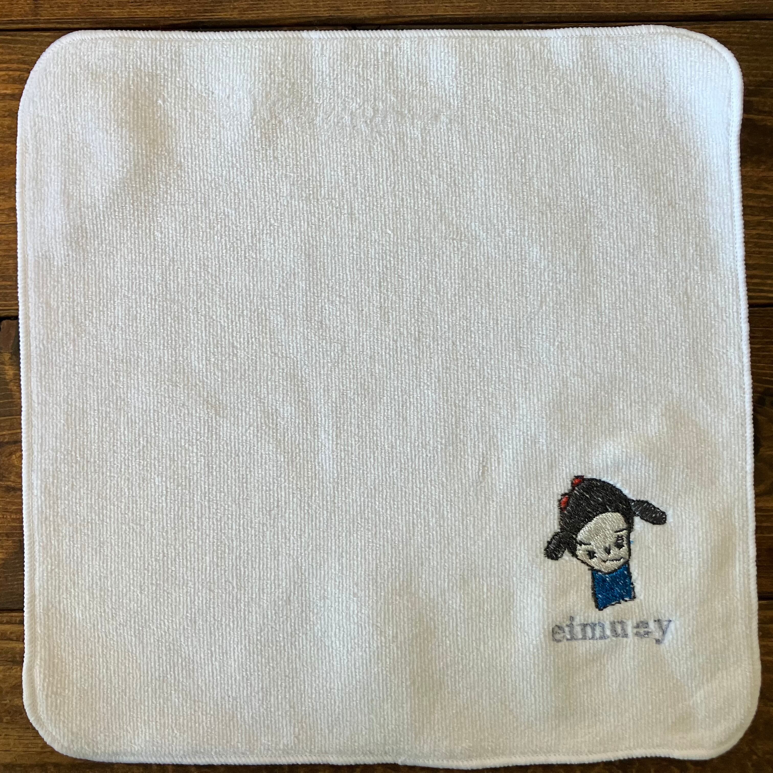 この似顔絵をワンポイント刺繍にしたエイムワイオリジナルのミニタオル(タオルハンカチ)です。