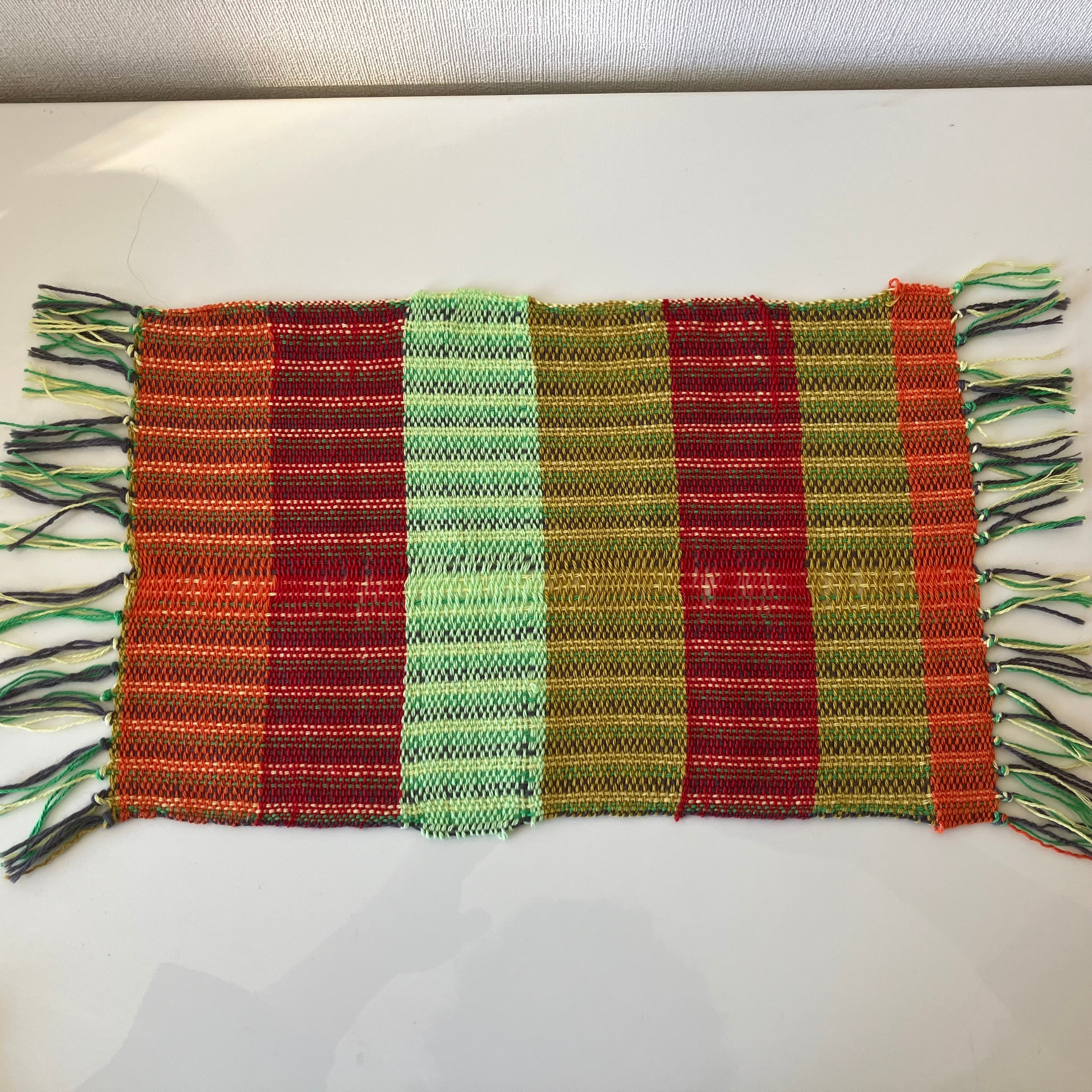 福祉作業所で障がいのある方々がこつこつと素敵に織り上げたさをり織りを使って作った一点もののティーマットです。