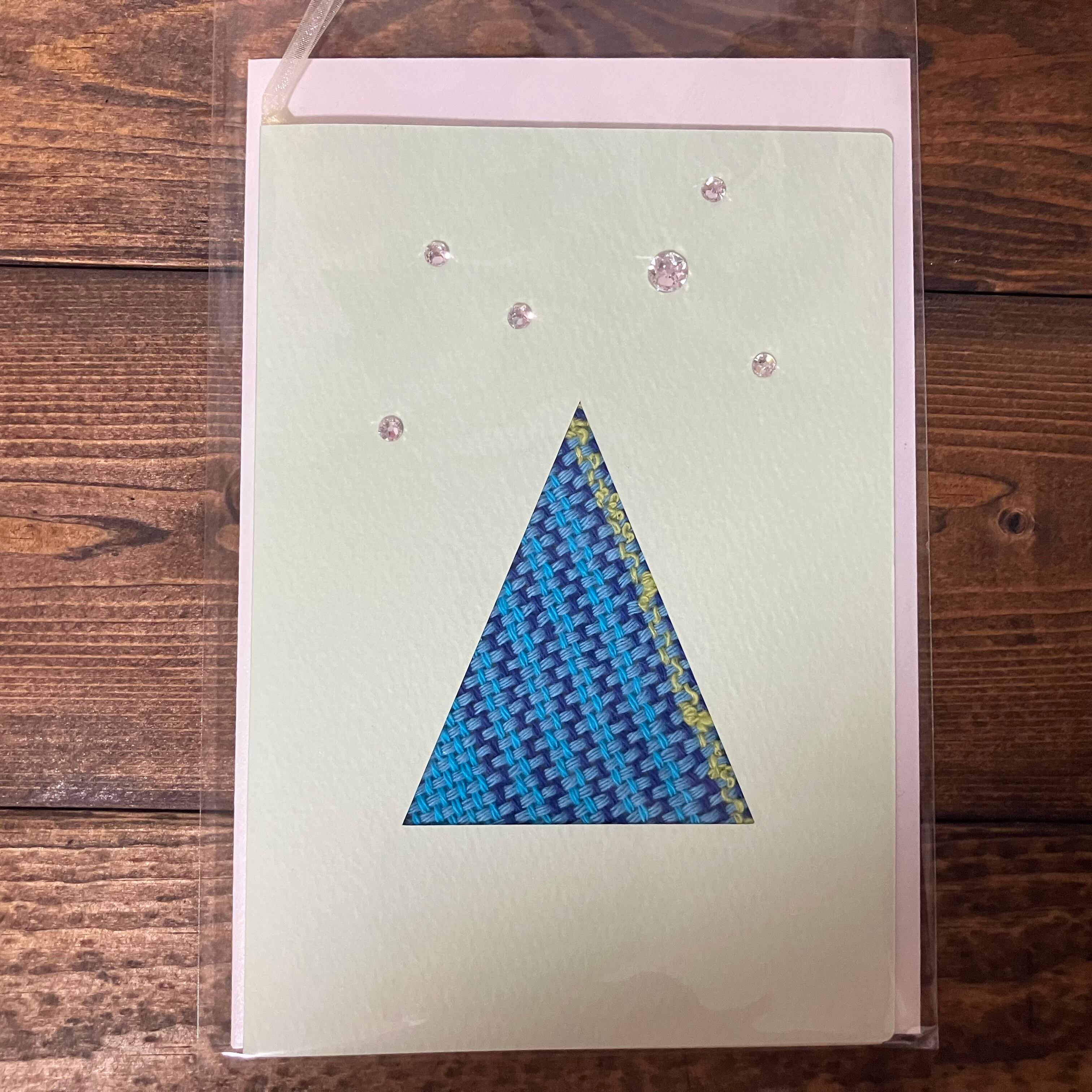 福祉作業所で障がいのある方々がこつこつと素敵に織り上げたさをり織りを使って作った一点もののグリーティングカードです。ホワイトの封筒とセットになっています。